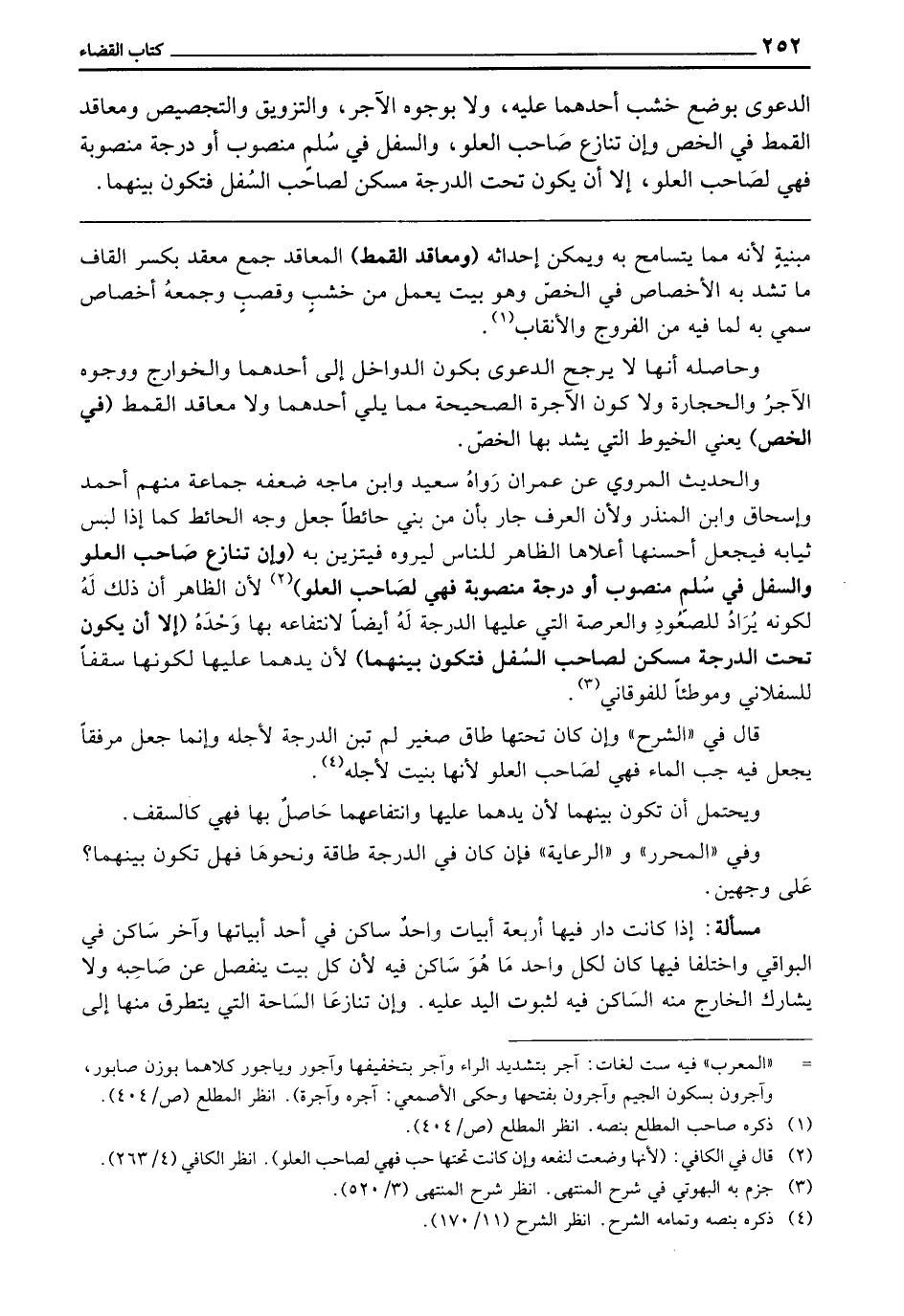 وَالْحَدِيثُ الْمَرْوِيُّ عَنْ عِمْرَانَ ـ رَوَاهُ سَعِيدٌ وَابْنُ مَاجَهْ ـ ضَعَّفَهُ جَمَاعَةٌ مِنْهُمْ: أَحْمَدُ وَإِسْحَاقُ وَابْنُ الْمُنْذِرِ وَلِأَنَّ الْعُرْفَ جَارٍ بِأَنَّ مَنْ بَنَى حَائِطًا جَعَلَ وَجْهَ الْحَائِطِ كَمَا إِذَا لَبِسَ ثِيَابَهُ، فَيَجْعَلُ أَحْسَنَهَا أَعْلَاهَا الظَّاهِرُ لِلنَّاسِ، لِيَرَوْهُ فَيَتَزَيَّنُ بِهِ (وَإِنْ تَنَازَعَ صَاحِبُ الْعُلُوِّ وَالسُّفْلِ فِي سُلَّمٍ مَنْصُوبٍ أَوْ دَرَجَةٍ) مَنْصُوبَةٍ، (فَهِيَ لِصَاحِبِ الْعُلُوِّ) لِأَنَّ الظَّاهِرَ أَنَّ ذَلِكَ لَهُ، لِكَوْنِهِ يُرَادُ لِلصُّعُودِ، وَالْعَرْصَةُ الَّتِي عَلَيْهَا الدَّرَجَةُ لَهُ أَيْضًا لِانْتِفَاعِهِ بِهَا وَحْدَهُ (إِلَّا أَنْ يَكُونَ تَحْتَ الدَّرَجَةِ مَسْكَنٌ لِصَاحِبِ السُّفْلِ فَتَكُونُ بَيْنَهُمَا) لِأَنَّ يَدَهُمَا عَلَيْهَا لِكَوْنِهَا سَقْفًا لِلسُّفْلَانِيِّ وَمَوْطِئًا لِلْفَوْقَانِيِّ.
