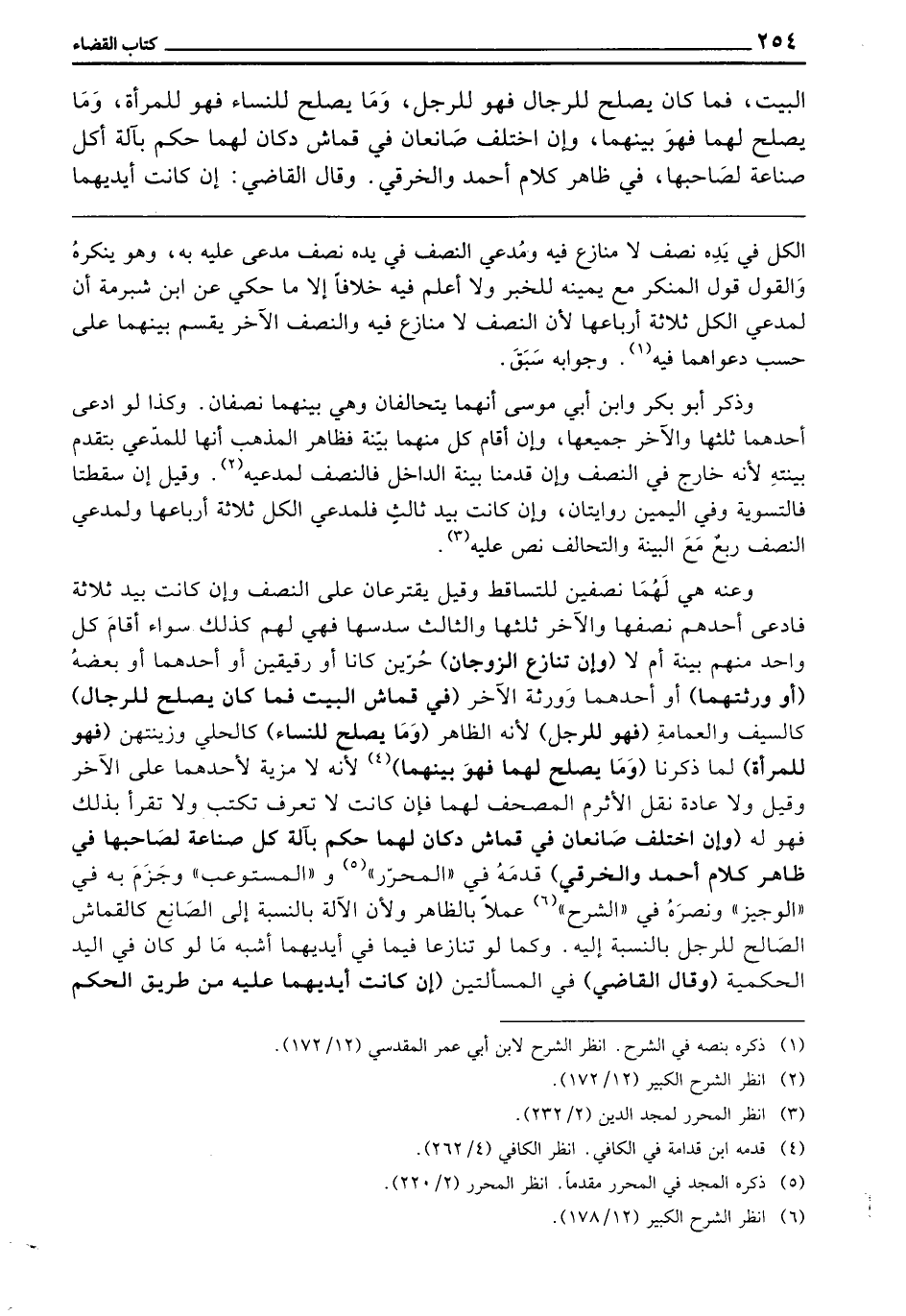 وَعَنْهُ: هِيَ لَهُمَا نِصْفَيْنِ لِلتَّسَاقُطِ، وَقِيلَ: يَقْتَرِعَانِ عَلَى النِّصْفِ. وَإِنْ كَانَتْ بِيَدِ ثَلَاثَةٍ فَادَّعَى أَحَدُهُمْ نِصْفَهَا، وَالْآخَرُ ثُلُثَهَا، وَالثَّالِثُ سُدُسَهَا، فَهِيَ لَهُمْ كَذَلِكَ، سَوَاءٌ أَقَامَ كُلُّ وَاحِدٍ مِنْهُمْ بَيِّنَةً أَمْ لَا (وَإِنْ تَنَازَعَ الزَّوْجَانِ) ، حُرَّيْنِ كَانَا أَوْ رَقِيقَيْنِ، أَوْ أَحَدُهُمَا أَوْ بَعْضُهُ، (أَوْ وَرَثَتُهُمَا) أَوْ أَحَدُهُمَا وَوَرَثَةُ الْآخَرِ (فِي قُمَاشِ الْبَيْتِ، فَمَا كَانَ يَصْلُحُ لِلرِّجَالِ) ، كَالسَّيْفِ وَالْعِمَامَةِ، (فَهُوَ لِلرَّجُلِ) لِأَنَّهُ الظَّاهِرُ (وَمَا يَصْلُحُ لِلنِّسَاءِ) ، كَالْحُلِيِّ وَزِينَتِهِنَّ، (فَهُوَ لِلْمَرْأَةِ) لِمَا ذَكَرْنَا (وَمَا يَصْلُحُ لَهُمَا فَهُوَ بَيْنَهُمَا) لِأَنَّهُ لَا مَزِيَّةَ لِأَحَدِهِمَا عَلَى الْآخَرِ، وَقِيلَ: وَلَا عَادَةَ، نَقَلَ الْأَثْرَمُ: الْمُصْحَفُ لَهُمَا، فَإِنْ كَانَتْ لَا تَعْرِفُ تَكْتُبُ وَلَا تَقْرَأُ بِذَلِكَ فَهُوَ لَهُ (وَإِنِ اخْتَلَفَ صَانِعَانِ فِي قُمَاشِ دُكَّانٍ لَهُمَا، حَكَمَ بِآلَةِ كُلِّ صِنَاعَةٍ لِصَاحِبِهَا، فِي ظَاهِرِ كَلَامِ أَحْمَدَ وَالْخِرَقِيِّ) قَدَّمَهُ فِي الْمُحَرَّرِ وَالْمُسْتَوْعِبِ، وَجَزَمَ بِهِ فِي الْوَجِيزِ، وَنَصَرَهُ فِي الشَّرْحِ عَمَلًا بِالظَّاهِرِ، وَلِأَنَّ الْآلَةَ بِالنِّسْبَةِ إِلَى الصَّانِعِ كَالْقُمَاشِ الصَّالِحِ لِلرَّجُلِ بِالنِّسْبَةِ إِلَيْهِ، وَكَمَا لَوْ تَنَازَعَا فِيمَا فِي أَيْدِيهِمَا، أَشْبَهَ مَا لَوْ كَانَ فِي الْيَدِ الْحُكْمِيَّةِ (وَقَالَ الْقَاضِي) فِي الْمَسْأَلَتَيْنِ (إِنْ كَانَتْ أَيْدِيهِمَا عَلَيْهِ مِنْ طَرِيقِ الْحُكْمِ