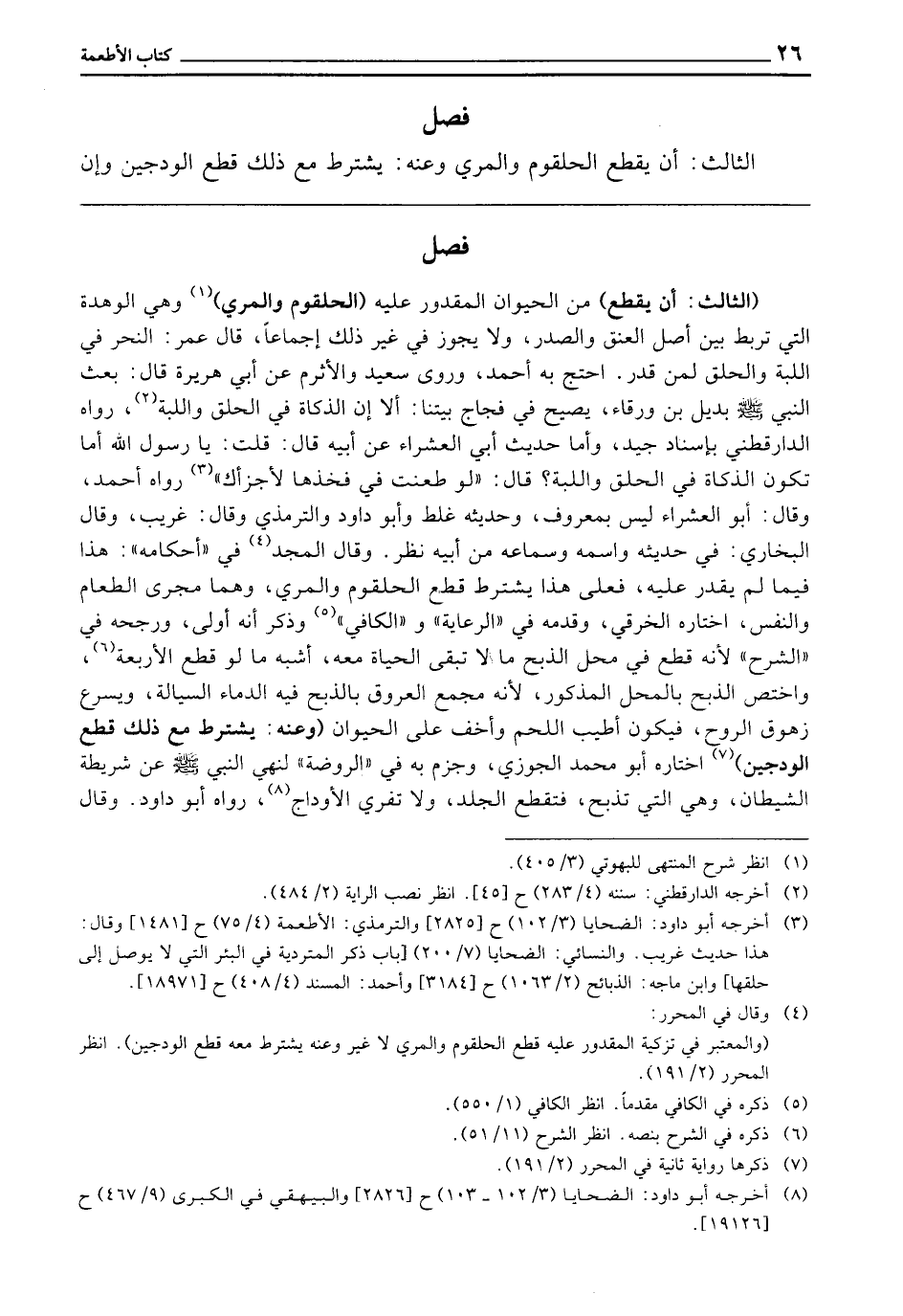 (الثَّالِثُ: أَنْ يَقْطَعَ) مِنَ الْحَيَوَانِ الْمَقْدُورِ عَلَيْهِ، (الْحُلْقُومَ والمري) وَهِيَ: الْوَهْدَةُ الَّتِي تَرْبِطُ بَيْنَ أَصْلِ الْعُنُقِ وَالصَّدْرِ، وَلَا يَجُوزُ فِي غَيْرِ ذَلِكَ إِجْمَاعًا، قَالَ عُمَرُ: النَّحْرُ فِي اللَّبَّةِ، وَالْحَلْقِ لِمَنْ قَدَرَ، احْتَجَّ بِهِ أَحْمَدُ، وَرَوَى سَعِيدٌ، وَالْأَثْرَمُ، عَنْ أَبِي هُرَيْرَةَ قَالَ: «بَعَثَ النَّبِيُّ - صَلَّى اللَّهُ عَلَيْهِ وَسَلَّمَ - بُدَيْلَ بْنَ وَرْقَاءَ يَصِيحُ فِي فِجَاجِ بَيْتِنَا: أَلَا إِنَّ الذَّكَاةَ فِي الْحَلْقِ وَاللَّبَّةِ» . رَوَاهُ الدَّارَقُطْنِيُّ بِإِسْنَادٍ جَيِّدٍ. وَأَمَّا حَدِيثُ أَبِي الْعُشَرَاءِ عَنْ أَبِيهِ، «قَالَ: قُلْتُ: يَا رَسُولَ اللَّهِ، أَمَا تَكُونُ الذَّكَاةُ فِي الْحَلْقِ وَاللَّبَّةِ؛ قَالَ: لَوْ طَعَنْتَ فِي فَخِذِهَا لَأَجْزَأَكَ» . رَوَاهُ أَحْمَدُ. وَقَالَ أَبُو الْعُشَرَاءِ لَيْسَ بِمَعْرُوفٍ، وَحَدِيثُهُ غَلَطٌ، وَأَبُو دَاوُدَ وَالتِّرْمِذِيُّ، وَقَالَ: غَرِيبٌ، وَقَالَ الْبُخَارِيُّ: فِي حَدِيثِهِ وَاسْمِهِ وَسَمَاعِهِ مِنْ أَبِيهِ نَظَرٌ، وَقَالَ الْمَجْدُ فِي أَحْكَامِهِ: هَذَا فِيمَا لَمْ يَقْدِرْ عَلَيْهِ، فَعَلَى هَذَا يُشْتَرَطُ قَطْعُ الْحُلْقُومِ والْمري، وَهُمَا مَجْرَى الطَّعَامِ وَالنَّفَسِ، اخْتَارَهُ الْخِرَقِيُّ، وَقَدَّمَهُ فِي الرِّعَايَةِ، وَالْكَافِي، وَذَكَرَ أَنَّهُ أَوْلَى، وَرَجَّحَهُ فِي الشَّرْحِ، لِأَنَّهُ قَطْعٌ فِي مَحَلِّ الذَّبْحِ مَا لَا تَبْقَى الْحَيَاةُ مَعَهُ، أَشْبَهَ مَا لَوْ قَطَعَ الْأَرْبَعَةَ، وَاخْتَصَّ الذَّبْحُ بِالْمَحَلِّ الْمَذْكُورِ، لِأَنَّهُ مَجْمَعُ الْعُرُوقِ بِالذَّبْحِ فِيهِ الدِّمَاءُ السَّيَّالَةُ، وَيُسْرِعُ زُهُوقُ الرُّوحِ، فَيَكُونُ أَطْيَبَ لِلَّحْمِ، وَأَخَفَّ عَلَى الْحَيَوَانِ، (وَعَنْهُ: يُشْتَرَطُ مَعَ ذَلِكَ قَطْعُ الْوَدَجَيْنِ) ، اخْتَارَهُ أَبُو مُحَمَّدٍ الْجَوْزِيُّ، وَجَزَمَ بِهِ فِي الرَّوْضَةِ، «لِنَهْيِ النَّبِيِّ - صَلَّى اللَّهُ عَلَيْهِ وَسَلَّمَ - عَنْ شَرِيطَةِ الشَّيْطَانِ» ، وَهِيَ الَّتِي تَذْبَحُ فَتَقْطَعُ الْجِلْدَ، وَلَا تَفْرِي الْأَوْدَاجَ، رَوَاهُ أَبُو دَاوُدَ، وَقَالَ