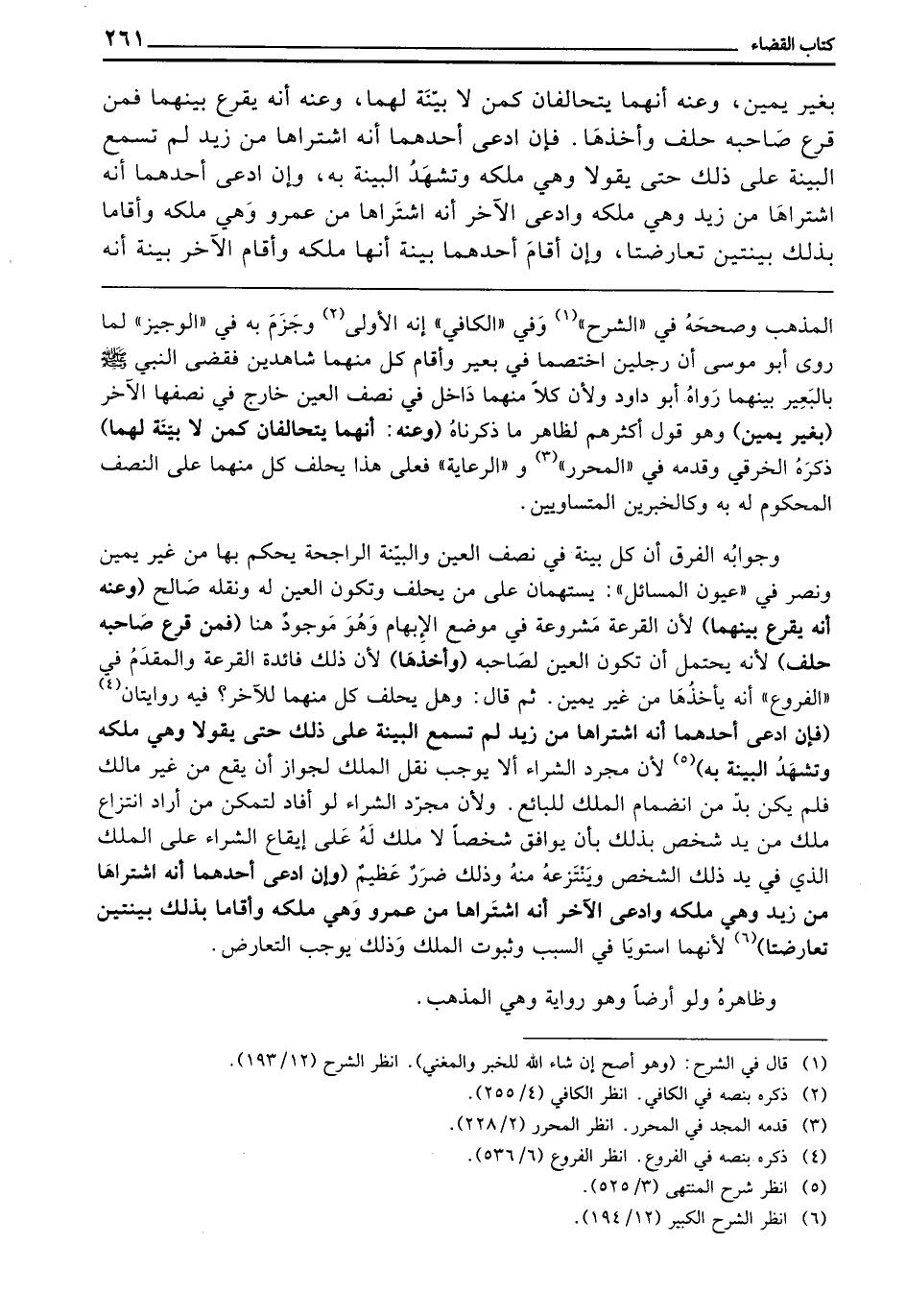 وَجَوَابُهُ: الْفَرْقُ أَنَّ كُلَّ بَيِّنَةٍ فِي نِصْفِ الْعَيْنِ، وَالْبَيِّنَةُ الرَّاجِحَةُ يَحْكُمُ بِهَا مِنْ غَيْرِ يَمِينٍ، وَنَصَرَ فِي عُيُونِ الْمَسَائِلِ: يَسْتَهِمَانِ عَلَى مَنْ يَحْلِفُ، وَتَكُونُ الْعَيْنُ لَهُ، وَنَقَلَهُ صَالِحٌ (وَعَنْهُ: أَنَّهُ يُقْرَعُ بَيْنَهُمَا) لِأَنَّ الْقُرْعَةَ مَشْرُوعَةٌ فِي مَوْضِعِ الْإِبْهَامِ، وَهُوَ مَوْجُودٌ هُنَا (فَمَنْ قَرَعَ صَاحِبَهُ حَلَفَ) لِأَنَّهُ يُحْتَمَلُ أَنْ تَكُونَ الْعَيْنُ لِصَاحِبِهِ (وَأَخَذَهَا) لِأَنَّ ذَلِكَ فَائِدَةُ الْقُرْعَةِ، وَالْمُقَدَّمُ فِي الْفُرُوعِ: أَنَّهُ يَأْخُذُهَا مِنْ غَيْرِ يَمِينٍ، ثُمَّ قَالَ: وَهَلْ يَحْلِفُ كُلٌّ مِنْهُمَا لِلْآخَرِ؛ فِيهِ رِوَايَتَانِ (فَإِنِ ادَّعَى أَحَدُهُمَا أَنَّهُ اشْتَرَاهَا مِنْ زَيْدٍ، لَمْ تُسْمَعِ الْبَيِّنَةُ عَلَى ذَلِكَ حَتَّى يَقُولَا: وَهِيَ مِلْكُهُ، وَتَشْهَدُ الْبَيِّنَةُ بِهِ) لِأَنَّ مُجَرَّدَ الشِّرَاءِ لَا يُوجِبُ نَقْلَ الْمِلْكِ؛ لِجَوَازِ أَنْ يَقَعَ مِنْ غَيْرِ مَالِكٍ، فَلَمْ يَكُنْ بُدٌّ مِنَ انْضِمَامِ الْمِلْكِ لِلْبَائِعِ، وَلِأَنَّ مُجَرَّدَ الشِّرَاءِ لَوْ أَفَادَ لَتَمَكَّنَ مَنْ أَرَادَ انْتِزَاعَ مِلْكٍ مِنْ يَدِ شَخْصٍ بِذَلِكَ، بِأَنْ يُوَافِقَ شَخْصًا لَا مِلْكَ لَهُ عَلَى إِيقَاعِ الشِّرَاءِ عَلَى الْمِلْكِ الَّذِي فِي يَدِ ذَلِكَ الشَّخْصِ، وَيَنْتَزِعُهُ مِنْهُ، وَذَلِكَ ضَرَرٌ عَظِيمٌ (وَإِنِ ادَّعَى أَحَدُهُمَا أَنَّهُ اشْتَرَاهَا مِنْ زَيْدٍ وَهِيَ مِلْكُهُ، وَادَّعَى الْآخَرُ أَنَّهُ اشْتَرَاهَا مِنْ عَمْرٍو وَهِيَ مِلْكُهُ، وَأَقَامَا بِذَلِكَ بَيِّنَتَيْنِ تَعَارَضَتَا) لِأَنَّهُمَا اسْتَوَيَا فِي السَّبَبِ وَثُبُوتِ الْمِلْكِ وَذَلِكَ يُوجِبُ التَّعَارُضَ.