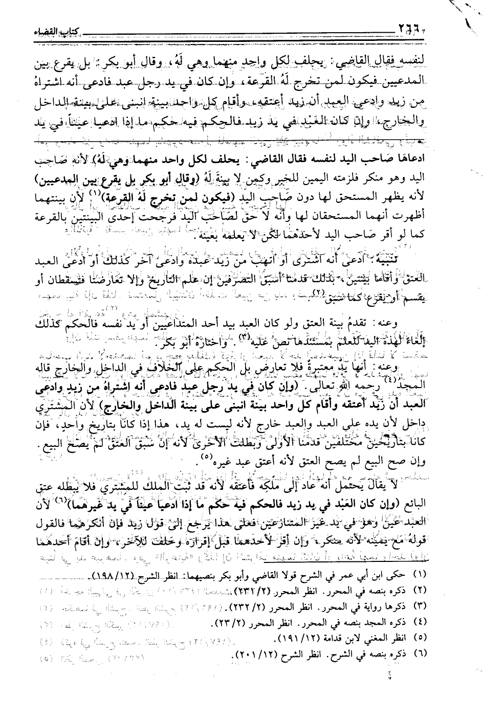 لِنَفْسِهِ، فَقَالَ الْقَاضِي: يَحْلِفُ لِكُلِّ وَاحِدٍ مِنْهُمَا، وَهِيَ لَهُ، وَقَالَ أَبُو بَكْرٍ: بَلْ يُقْرَعُ بَيْنَ الْمُدَّعِيَيْنِ فَيكُونُ لِمَنْ تَخْرُجُ لَهُ الْقُرْعَةُ، وَإِنْ كَانَ فِي يَدِ رَجُلٍ عَبْدٍ فَادَّعَى أَنَّهُ اشْتَرَاهُ مِنْ زَيْدٍ، وَادَّعَى الْعَبْدُ أَنَّ زَيْدًا أَعْتَقَهُ، وَأَقَامَ كُلُّ وَاحِدٍ بَيِّنَةً انْبَنَى عَلَى بَيِّنَةِ الدَّاخِلِ وَالْخَارِجِ، وَإِنْ كَانَ الْعَبْدُ فِي يَدِ زَيْدٍ، فَالْحُكْمُ فِيهِ حُكْمُ مَا إِذَا ادَّعَيَا عَيْنًا فِي يَدِ