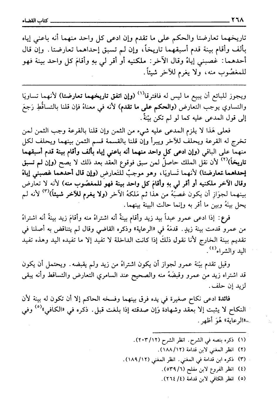 تَارِيخُهُمَا تَعَارَضَتَا، وَالْحُكْمُ عَلَى مَا تَقَدَّمَ، وَإِنِ ادَّعَى كُلُّ وَاحِدٍ مِنْهُمَا أَنَّهُ بَاعَنِي إِيَّاهُ بِأَلْفٍ وَأَقَامَ بَيِّنَةً، قَدَّمَ أَسْبَقَهُمَا تَارِيخًا، وَإِنْ لَمْ تَسْبِقْ إِحْدَاهُمَا تَعَارَضَتَا، وَإِنْ قَالَ أَحَدُهُمَا: غَصَبَنِي إِيَّاهُ، وَقَالَ الْآخَرُ: مَلَّكَنِيهِ، أَوْ أَقَرَّ لِي بِهِ، وَأَقَامَ كُلُّ وَاحِدٍ بَيِّنَةً فَهُوَ لِلْمَغْصُوبِ مِنْهُ، وَلَا يَغْرَمُ لِلْآخَرِ شَيْئًا.