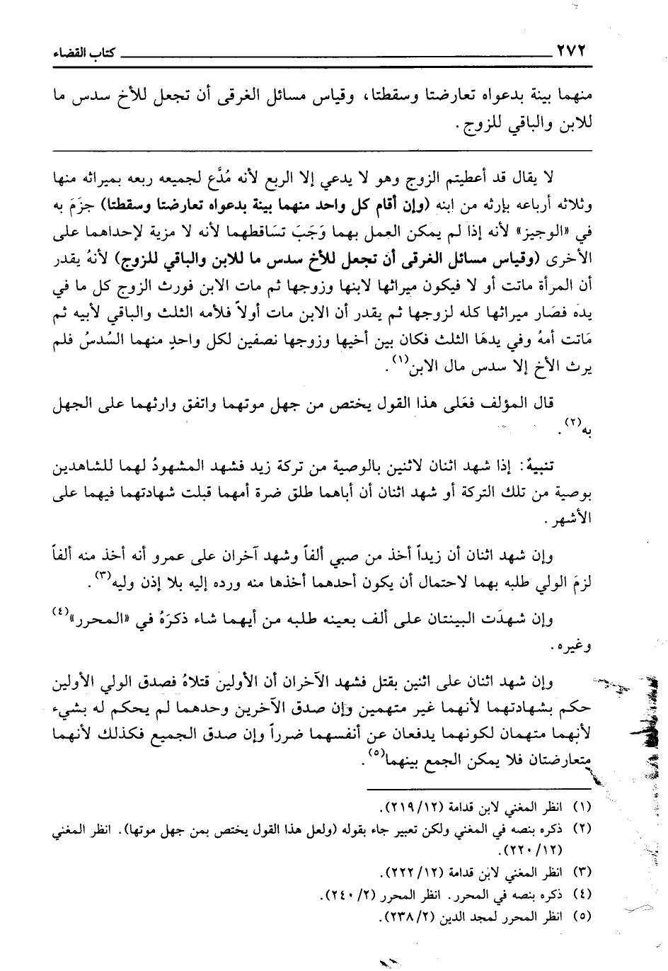ـــــــــــــــــــــــــــــQلَا يُقَالُ: قَدْ أَعْطَيْتُمُ الزَّوْجَ وَهُوَ لَا يَدَّعِي إِلَّا الرُّبُعَ؛ لِأَنَّهُ مُدَّعٍ لِجَمِيعِهِ؛ رُبُعُهُ بِمِيرَاثِهِ مِنْهَا وَثَلَاثَةُ أَرْبَاعِهِ بِإِرْثِهِ مِنِ ابْنِهِ، (وَإِنْ أَقَامَ كُلُّ وَاحِدٍ مِنْهُمَا بَيِّنَةً بِدَعْوَاهُ، تَعَارَضَتَا وَسَقَطَتَا) جَزَمَ بِهِ فِي الْوَجِيزِ؛ لِأَنَّهُ إِذَا لَمْ يُمْكِنِ الْعَمَلُ بِهِمَا وَجَبَ تَسَاقُطُهُمَا؛ لِأَنَّهُ لَا مَزِيَّةَ لِإِحْدَاهُمَا عَلَى الْأُخْرَى (وَقِيَاسُ مَسَائِلِ الْغَرْقَى أَنْ تُجْعَلَ لِلْأَخِ سُدُسُ مَا لِلِابْنِ، وَالْبَاقِي لِلزَّوْجِ) لِأَنَّهُ يُقَدَّرُ أَنَّ الْمَرْأَةَ مَاتَتْ أَوَّلًا، فَيَكُونُ مِيرَاثُهَا لِابْنِهَا وَزَوْجِهَا، ثُمَّ مَاتَ الِابْنُ فَوَرِثَ الزَّوْجُ كُلَّ مَا فِي يَدِهِ، فَصَارَ مِيرَاثُهَا كُلُّهُ لِزَوْجِهَا، ثُمَّ يُقَدَّرُ أَنَّ الِابْنَ مَاتَ أَوَّلًا فَلِأُمِّهِ الثُّلُثُ وَالْبَاقِي لِأَبِيهِ، ثُمَّ مَاتَتْ أُمُّهُ وَفِي يَدِهَا الثُّلُثُ فَكَانَ بَيْنَ أَخِيهَا وَزَوْجِهَا نِصْفَيْنِ، لِكُلِّ وَاحِدٍ مِنْهُمَا السُّدُسُ، فَلَمْ يَرِثِ الْأَخُ إِلَّا سُدُسَ مَالِ الِابْنِ.