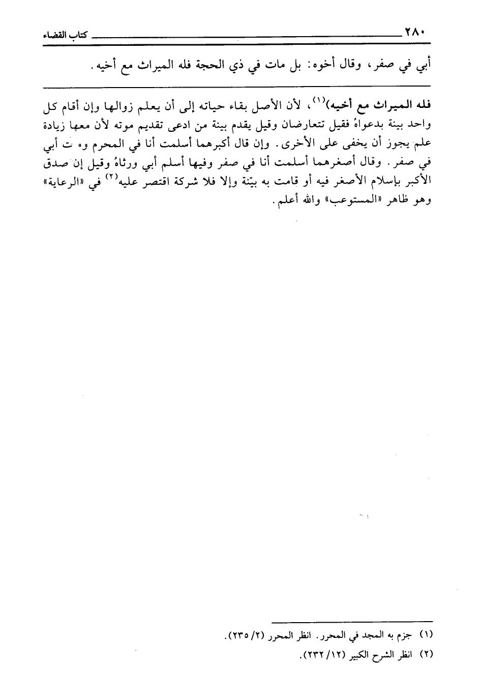 ـــــــــــــــــــــــــــــQفَلَهُ الْمِيرَاثُ مَعَ أَخِيهِ) لِأَنَّ الْأَصْلَ بَقَاءُ حَيَاتِهِ إِلَى أَنْ يُعْلَمَ زَوَالُهَا، وَإِنْ أَقَامَ كُلُّ وَاحِدٍ بَيِّنَةً بِدَعْوَاهُ، فَقِيلَ: تَتَعَارَضَانِ، وَقِيلَ: يُقَدِّمُ بَيِّنَةَ مَنِ ادَّعَى تَقْدِيمَ مَوْتِهِ؛ لِأَنَّ مَعَهَا زِيَادَةُ عِلْمٍ يَجُوزُ أَنْ يَخْفَى عَلَى الْأُخْرَى، وَإِنْ قَالَ أَكْبَرُهُمَا: أَسْلَمْتُ أَنَا فِي الْمُحَرَّمِ، وَمَاتَ أَبِي فِي صَفَرٍ، وَقَالَ أَصْغَرُهُمَا: أَسْلَمْتُ أَنَا فِي صَفَرٍ، وَفِيهَا أَسْلَمَ أَبِي وَرِثَاهُ، وَقِيلَ: إِنْ صَدَقَ الْأَكْبَرُ بِإِسْلَامِ الْأَصْغَرِ فِيهِ، أَوْ قَامَتْ بِهِ بَيِّنَةٌ، وَإِلَّا فَلَا شَرِكَةَ، اقْتَصَرَ عَلَيْهِ فِي الرِّعَايَةِ، وَهُوَ ظَاهِرُ الْمُسْتَوْعِبِ، وَاللَّهُ أَعْلَمُ.