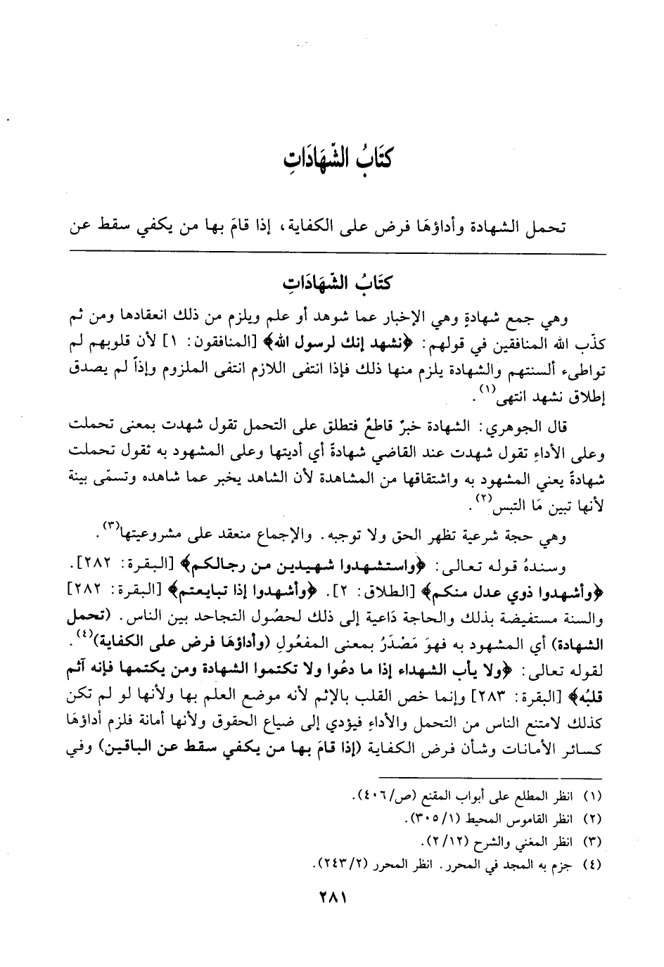 تَحَمُّلُ الشَّهَادَةِ وَأَدَاؤُهَا فَرْضٌ عَلَى الْكِفَايَةِ إِذَا قَامَ بِهِا مَنْ يَكْفِي سَقَطَ عَنِ