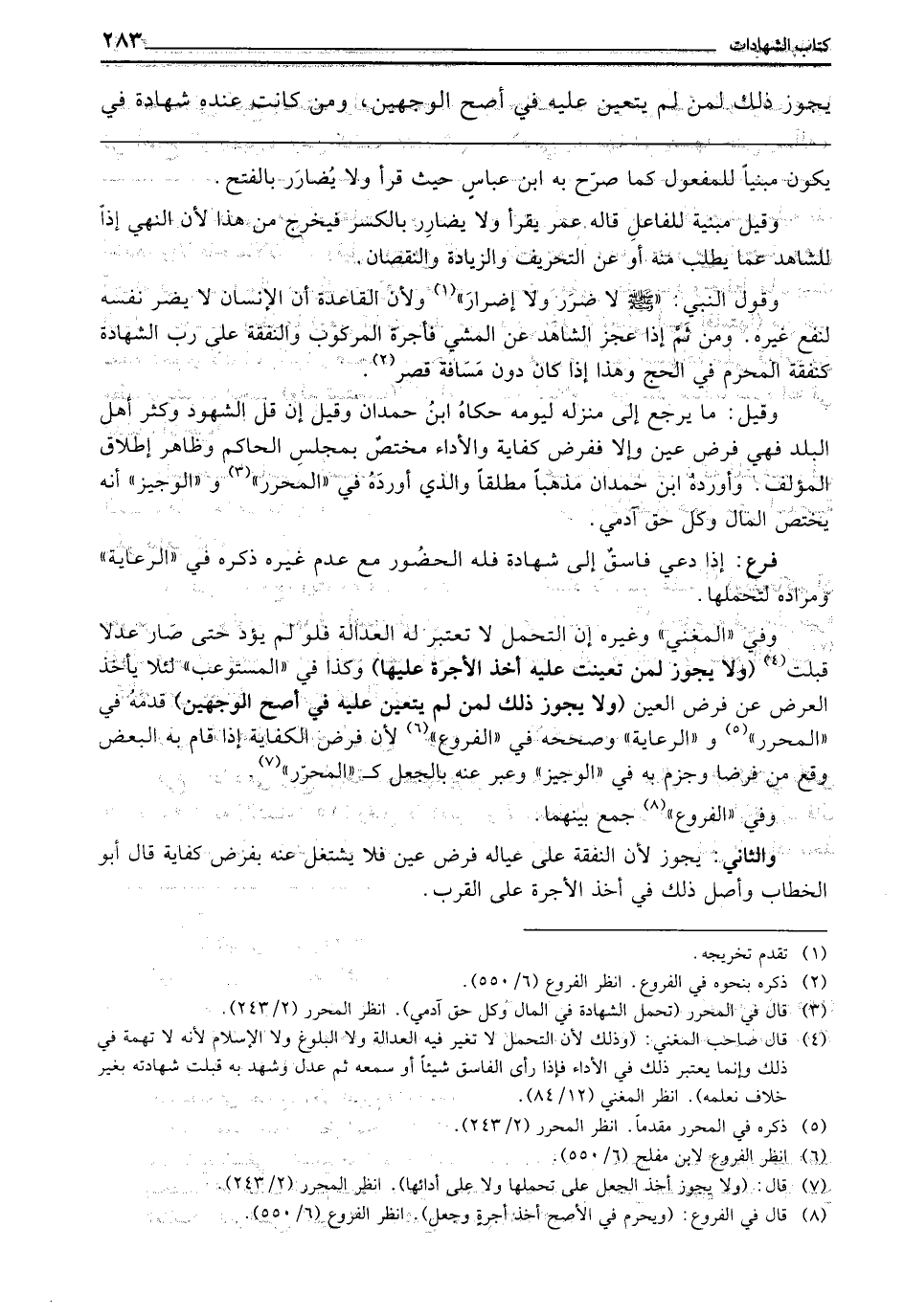 وَقَوْلُ النَّبِيِّ - صَلَّى اللَّهُ عَلَيْهِ وَسَلَّمَ - «لَا ضَرَرَ وَلَا إِضْرَارَ» وَلِأَنَّ الْقَاعِدَةَ أَنَّ الْإِنْسَانَ لَا يَضُرُّ نَفْسَهُ لِنَفْعِ غَيْرِهِ، وَمِنْ ثَمَّ إِذَا عَجَزَ الشَّاهِدُ عَنِ الْمَشْيِ فَأُجْرَةُ الْمَرْكُوبِ وَالنَّفَقَةِ عَلَى رَبِّ الشَّهَادَةِ، كَنَفَقَةِ الْمُحْرِمِ فِي الْحَجِّ، وَهَذَا إِذَا كَانَ دُونَ مَسَافَةِ قَصْرٍ.