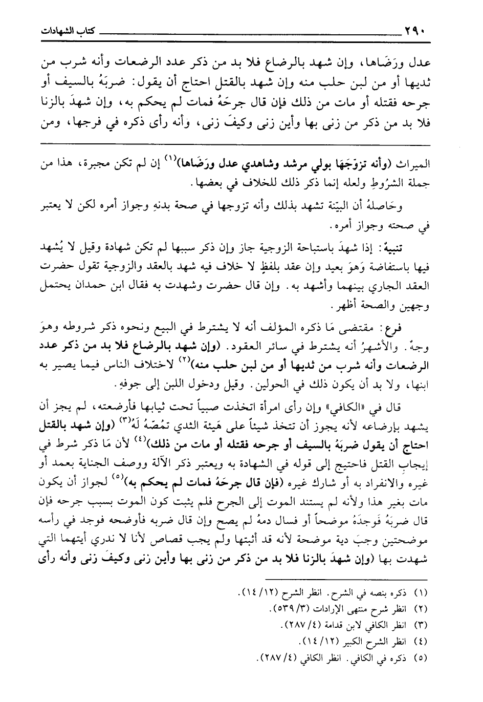 قَالَ فِي الْكَافِي: وَإِنْ رَأَى امْرَأَةً اتَّخَذَتْ صَبِيًّا تَحْتَ ثِيَابِهَا فَأَرْضَعَتْهُ، لَمْ يَجُزْ أَنْ يَشْهَدَ بِإِرْضَاعِهِ؛ لِأَنَّهُ يَجُوزُ أَنْ تَتَّخِذَ شَيْئًا عَلَى هَيْئَةِ الثَّدْيِ تُمِصُّهُ لَهُ. (وَإِنْ شَهِدَ بِالْقَتْلِ، احْتَاجَ أَنْ يَقُولَ: ضَرَبَهُ بِالسَّيْفِ، أَوْ جَرَحَهُ فَقَتَلَهُ، أَوْ مَاتَ مِنْ ذَلِكَ) لِأَنَّ مَا ذَكَرَ شَرْطٌ فِي إِيجَابِ الْقَتْلِ، فَاحْتِيجَ إِلَى قَوْلِهِ فِي الشَّهَادَةِ بِهِ، وَيُعْتَبَرُ ذِكْرُ الْآلَةِ، وَوَصْفُ الْجِنَايَةِ بِعَمْدٍ أَوْ غَيْرِهِ، وَالِانْفِرَادُ بِهِ أَوْ شَارَكَ غَيْرَهُ، (فَإِنْ قَالَ: جَرَحَهُ فَمَاتَ، لَمْ يُحْكَمْ بِهِ) لِجَوَازِ أَنْ يَكُونَ مَاتَ بِغَيْرِ هَذَا، وَلِأَنَّهُ لَمْ يَسْتَنِدِ الْمَوْتُ إِلَى الْجُرْحِ، فَلَمْ يَثْبُتْ كَوْنُ الْمَوْتِ بِسَبَبِ جُرْحِهِ، فَإِنْ قَالَ: ضَرَبَهُ فَوَجَدَهُ مُوَضَّحًا، أَوْ فَسَالَ دَمُهُ، لَمْ يَصِحَّ، وَإِنْ قَالَ: ضَرَبَهُ فَأَوْضَحَهُ، فَوَجَدَ فِي رَأْسِهِ مُوَضَّحَتَيْنِ وَجَبَ دِيَةٌ مُوَضَّحَةٌ؛ لِأَنَّهُ قَدْ أَثْبَتَهَا، وَلَمْ يَجِبْ قِصَاصٌ؛ لِأَنَّا لَا نَدْرِي أَيَّتَهُمَا الَّتِي شَهِدَ بِهَا (وَإِنْ شَهِدَ بِالزِّنَا فَلَا بُدَّ مِنْ ذِكْرِ مَنْ زَنَى بِهَا، وَأَيْنَ زَنَى؛ وَكَيْفَ زَنَى؛ وَأَنَّهُ رَأَى