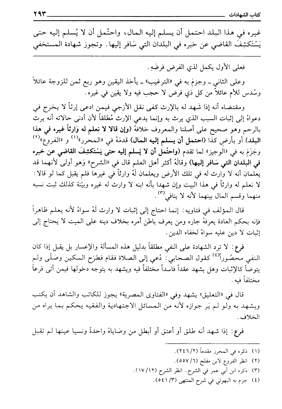 وَمُقْتَضَاهُ: أَنَّهُ إِذَا شَهِدَ لَهُ بِالْإِرْثِ كَفَى، نَقَلَ الْأَزَجِيُّ فِيمَنِ ادَّعَى إِرْثًا، لَا يَخْرُجُ فِي دَعْوَاهُ إِلَى إِثْبَاتِ السَّبَبِ الَّذِي يَرِثُ بِهِ، وَإِنَّمَا يَدَّعِي الْإِرْثَ مُطْلَقًا؛ لِأَنَّ أَدْنَى حَالَاتِهِ أَنَّهُ يَرِثُ بِالرَّحِمِ، وَهُوَ صَحِيحٌ عَلَى أَصْلِنَا، وَالْمَعْرُوفُ خِلَافَهُ (وَإِنْ قَالَا: لَا نَعْلَمُ لَهُ وَارِثًا غَيْرَهُ فِي هَذَا الْبَلَدِ) أَوْ بِأَرْضِ كَذَا (احْتَمَلَ أَنْ يُسَلِّمَ إِلَيْهِ الْمَالَ) قَدَّمَهُ فِي الْمُحَرَّرِ وَالْفُرُوعِ وَجَزَمَ بِهِ فِي الْوَجِيزِ؛ لِمَا تَقَدَّمَ (وَاحْتَمَلَ أَنْ لَا يُسَلِّمَ إِلَيْهِ حَتَّى يَسْتَكْشِفَ الْقَاضِي عَنْ خَبَرِهِ فِي الْبُلْدَانِ الَّتِي سَافَرَ إِلَيْهَا) وَقَالَهُ أَكْثَرُ أَهْلِ الْعِلْمِ، قَالَ فِي الشَّرْحِ: وَهُوَ أَوْلَى؛ لِأَنَّهُمَا قَدْ يَعْلَمَانِ أَنَّهُ لَا وَارِثَ لَهُ فِي تِلْكَ الْأَرْضِ، وَيَعْلَمَانِ لَهُ وَارِثًا فِي غَيْرِهَا فَلَمْ يُقْبَلْ، كَمَا لَوْ قَالَا: لَا نَعْلَمُ لَهُ وَارِثًا فِي هَذَا الْبَيْتِ، وَإِنْ شَهِدَا بِأَنَّهُ ابْنُهُ لَا وَارِثَ لَهُ غَيْرُهُ، وَبَيِّنَةٌ كَذَلِكَ ثَبَتَ نَسَبُهُ مِنْهُمَا وَقُسِّمَ الْمَالُ بَيْنَهُمَا، لِأَنَّهُ لَا يُنَافِي.