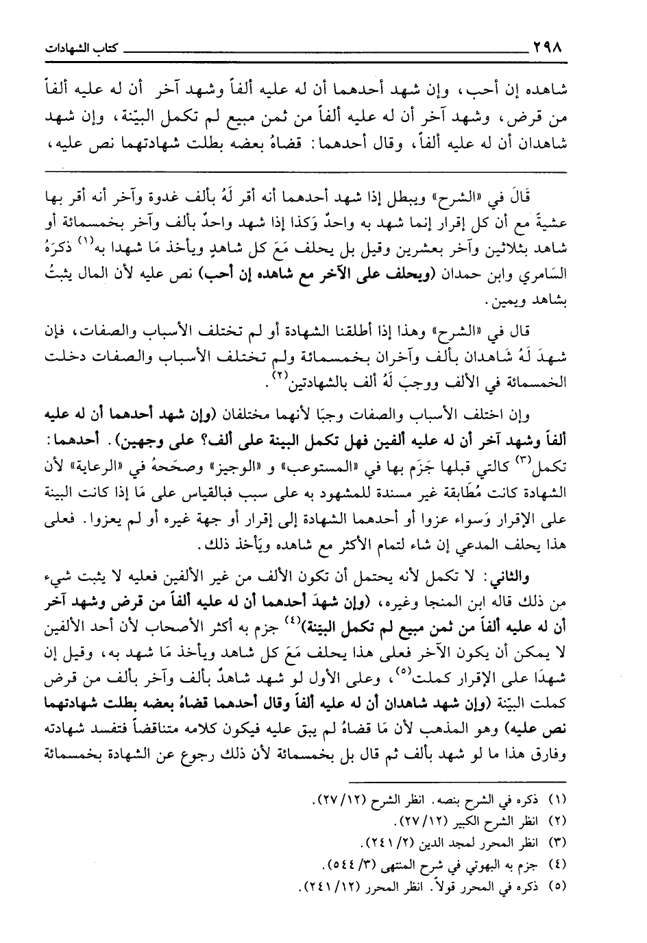 وَالثَّانِي: لَا تَكْمُلُ؛ لِأَنَّهُ يُحْتَمَلُ أَنْ تَكُونَ الْأَلْفُ مِنْ غَيْرِ الْأَلْفَيْنِ، فَعَلَيْهِ لَا يَثْبُتُ شَيْءٌ مِنْ ذَلِكَ، قَالَهُ ابْنُ الْمُنَجَّا وَغَيْرُهُ (وَإِنْ شَهِدَ أَحَدُهُمَا أَنَّ لَهُ عَلَيْهِ أَلْفًا مِنْ قَرْضٍ، وَشَهِدَ آخَرُ أَنَّ لَهُ عَلَيْهِ أَلْفًا مِنْ ثَمَنٍ مَبِيعٍ، لَمْ تَكْمُلِ الْبَيِّنَةُ) جَزَمَ بِهِ أَكْثَرُ الْأَصْحَابِ؛ لِأَنَّ أَحَدَ الْأَلْفَيْنِ لَا يُمْكِنُ أَنْ يَكُونَ الْآخَرَ، فَعَلَى هَذَا: يَحْلِفُ مَعَ كُلِّ شَاهِدٍ، وَيَأْخُذُ مَا شَهِدَ بِهِ، وَقِيلَ: إِنْ شَهِدَا عَلَى الْإِقْرَارِ كَمَلَتْ، وَعَلَى الْأَوَّلِ لَوْ شَهِدَ شَاهِدٌ بِأَلْفٍ وَآخَرُ بِأَلْفٍ مِنْ قَرْضٍ كَمَلَتِ الْبَيِّنَةُ، (وَإِنْ شَهِدَ شَاهِدَانِ أَنَّ لَهُ عَلَيْهِ أَلْفًا، وَقَالَ أَحَدُهُمَا: قَضَاهُ بَعْضُهُ، بَطَلَتْ شَهَادَتُهُمَا، نَصَّ عَلَيْهِ) وَهُوَ الْمَذْهَبُ؛ لِأَنَّ مَا قَضَاهُ لَمْ يَبْقَ عَلَيْهِ، فَيَكُونُ كَلَامُهُ مُتَنَاقِضًا فَتَفْسُدُ شَهَادَتُهُ، وَفَارَقَ هَذَا مَا لَوْ شَهِدَ بِأَلْفٍ، ثُمَّ قَالَ: بَلْ بِخَمْسِمِائَةٍ؛ لِأَنَّ ذَلِكَ رُجُوعٌ عَنِ الشَّهَادَةِ بِخَمْسِمِائَةٍ