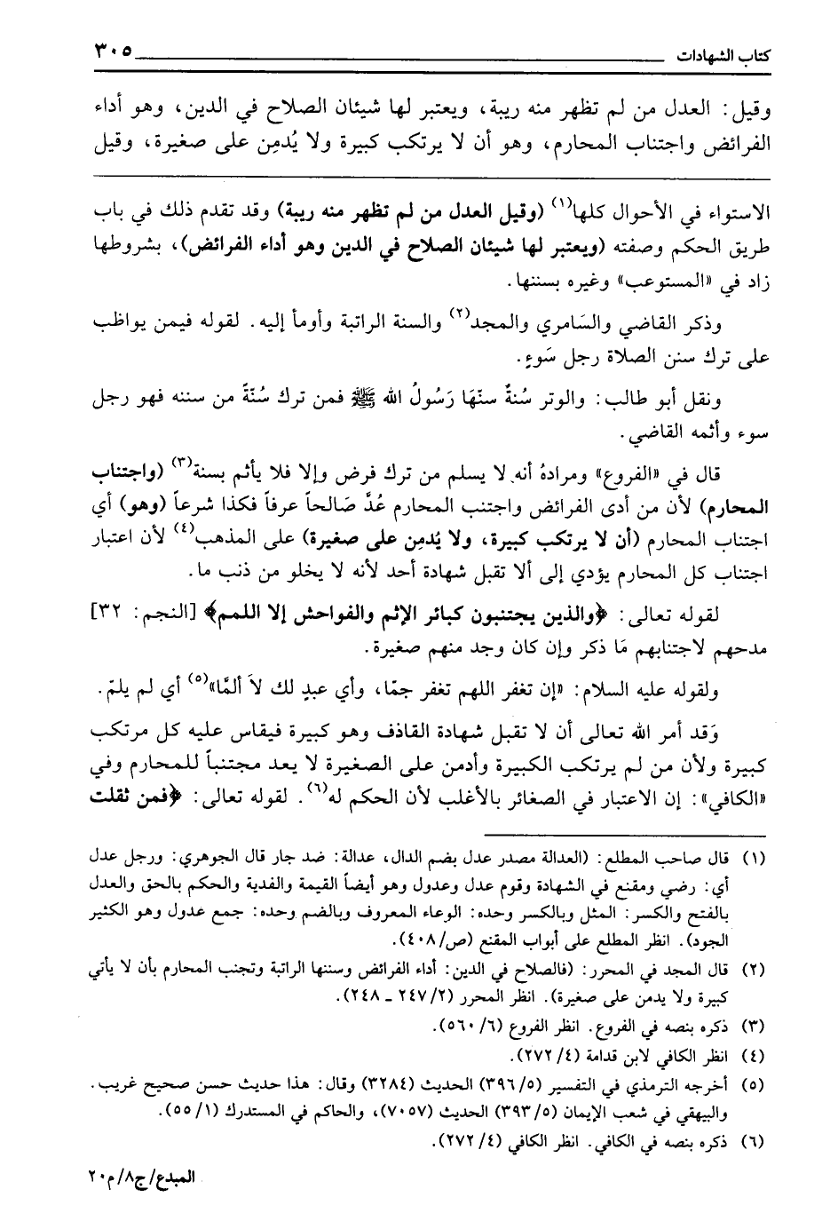 قَالَ فِي الْفُرُوعِ: وَمُرَادُهُ أَنَّهُ لَا يَسْلَمُ مِنْ تَرْكِ فَرْضٍ، وَإِلَّا فَلَا يَأْثَمُ بِسُّنَّةٍ (وَاجْتِنَابُ الْمَحَارِمِ) لِأَنَّ مَنْ أَدَّى الْفَرَائِضَ، وَاجْتَنَبَ الْمَحَارِمَ، عُدَّ صَالِحًا عُرْفًا، فَكَذَا شَرْعًا (وَهُوَ) أَيِ: اجْتِنَابُ الْمَحَارِمِ (أَنْ لَا يَرْتَكِبَ كَبِيرَةً، وَلَا يُدْمِنَ عَلَى صَغِيرَةٍ) عَلَى الْمَذْهَبِ؛ لِأَنَّ اعْتِبَارَ اجْتِنَابِ كُلِّ الْمَحَارِمِ يُؤَدِّي إِلَى أَلَّا تُقْبَلَ شَهَادَةُ أَحَدٍ؛ لِأَنَّهُ لَا يَخْلُو مِنْ ذَنْبٍ مَا.