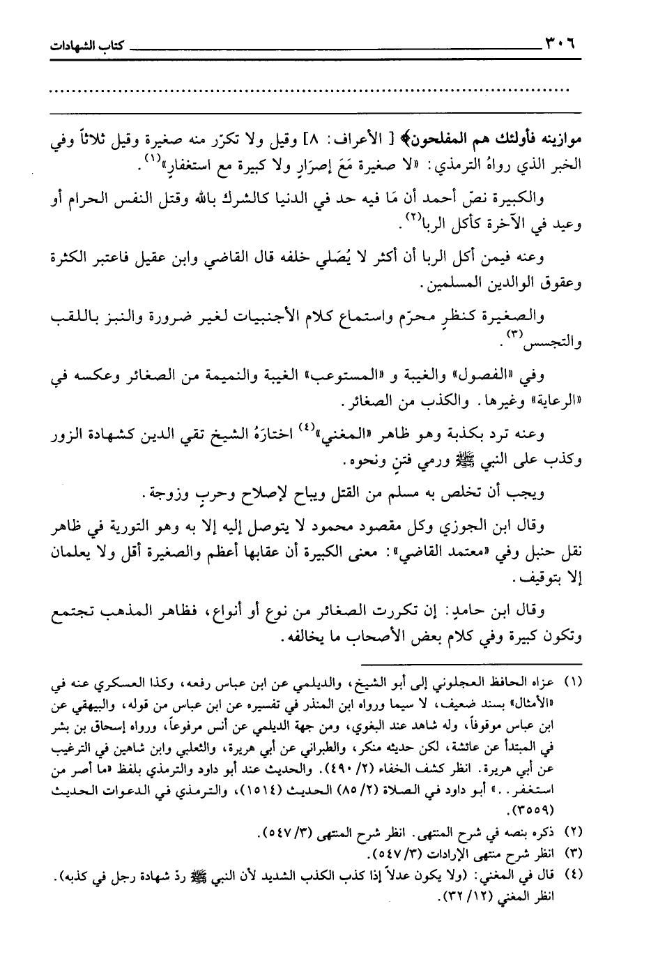 وَالْكَبِيرَةُ: نَصَّ أَحْمَدُ أَنَّ مَا فِيهِ حَدٌّ فِي الدُّنْيَا، كَالشِّرْكِ بِاللَّهِ وَقَتْلِ النَّفْسِ الْحَرَامِ، أَوْ وَعِيدٍ فِي الْآخِرَةِ، كَأَكْلِ الرِّبَا.