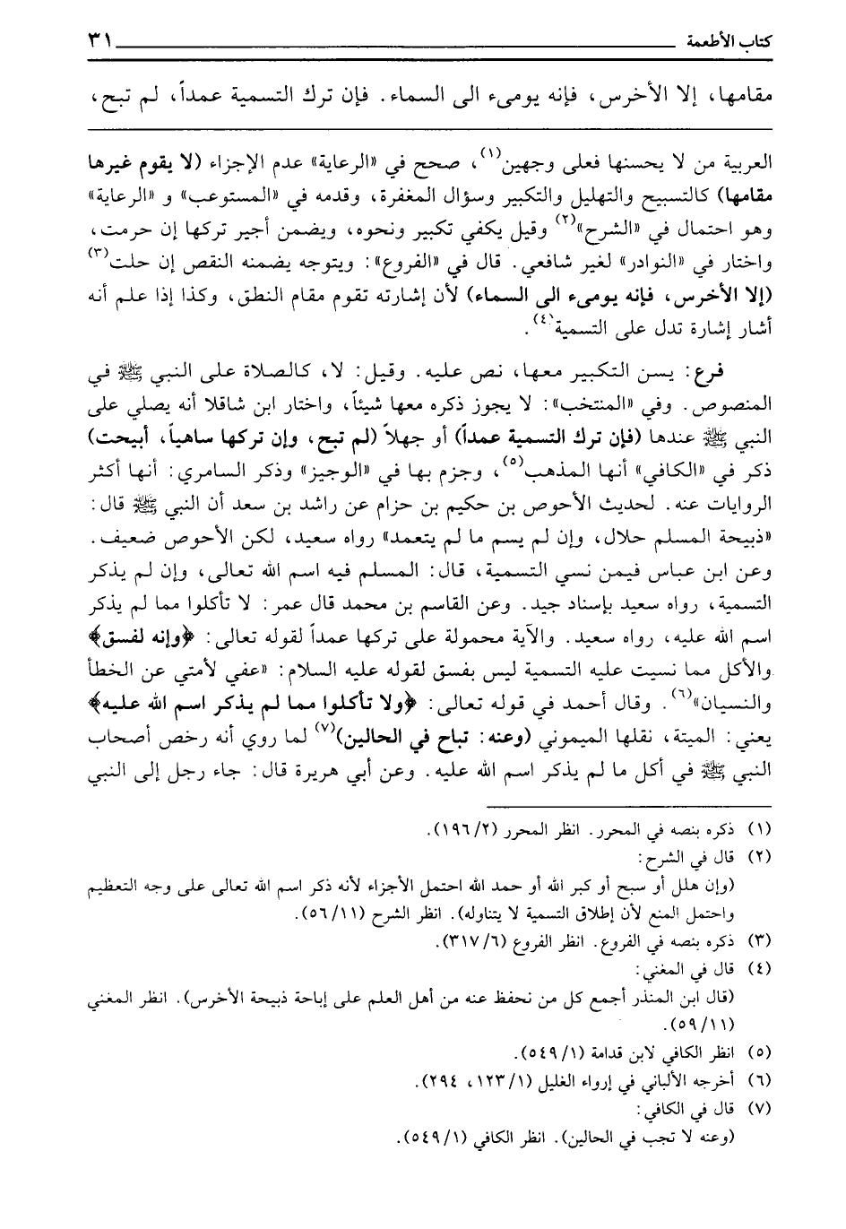 فَرْعٌ: يُسَنُّ التَّكْبِيرُ مَعَهَا، نَصَّ عَلَيْهِ، وَقِيلَ: لَا، كَالصَّلَاةِ عَلَى النَّبِيِّ - صَلَّى اللَّهُ عَلَيْهِ وَسَلَّمَ - فِي الْمَنْصُوصِ، وَفِي الْمُنْتَخَبِ: لَا يَجُوزُ ذِكْرُهُ مَعَهَا شَيْئًا، وَاخْتَارَ ابْنُ شَاقْلَا: أَنَّهُ يُصَلِّي عَلَى النَّبِيِّ - صَلَّى اللَّهُ عَلَيْهِ وَسَلَّمَ - عِنْدَهَا، (فَإِنْ تَرَكَ التَّسْمِيَةَ) عَمْدًا، أَوْ جَهْلًا، (لَمْ تُبَحْ، وَإِنْ تَرَكَهَا سَاهِيًا أُبِيحَتْ) ذَكَرَ فِي الْكَافِي: أَنَّهَا الْمَذْهَبُ، وَجَزَمَ بِهَا فِي الْوَجِيزِ، وَذَكَرَ السَّامِرِيُّ: أَنَّهَا أَكْثَرُ الرِّوَايَاتِ عَنْهُ، لِحَدِيثِ الْأَحْوَصِ بْنِ حَكِيمِ بْنِ حِزَامٍ، عَنْ رَاشِدِ بْنِ سَعْدٍ، «أَنَّ النَّبِيَّ - صَلَّى اللَّهُ عَلَيْهِ وَسَلَّمَ - قَالَ: ذَبِيحَةُ الْمُسْلِمِ حَلَالٌ، وَإِنْ لَمْ يُسَمِّ، مَا لَمْ يَتَعَمَّدْ.» رَوَاهُ سَعِيدٌ، لَكِنَّ الْأَحْوَصَ ضَعِيفٌ، وَعَنِ ابْنِ عَبَّاسٍ، فِيمَنْ نَسِيَ التَّسْمِيَةَ، قَالَ: الْمُسْلِمُ فِيهِ اسْمُ اللَّهِ تَعَالَى، وَإِنْ لَمْ يَذْكُرِ التَّسْمِيَةَ. رَوَاهُ سَعِيدٌ بِإِسْنَادٍ جَيِّدٍ، وَعَنِ الْقَاسِمِ بْنِ مُحَمَّدٍ، قَالَ عُمَرُ: لَا تَأْكُلُوا مِمَّا لَمْ يُذْكَرِ اسْمُ اللَّهِ عَلَيْهِ. رَوَاهُ سَعِيدٌ. وَالْآيَةُ مَحْمُولَةٌ عَلَى تَرْكِهَا عَمْدًا، لِقَوْلِهِ تَعَالَى {وَإِنَّهُ لَفِسْقٌ} [الأنعام: 121] وَالْأَكْلُ مِمَّا نَسِيتَ عَلَيْهِ التَّسْمِيَةَ لَيْسَ بِفِسْقٍ، لِقَوْلِهِ - عَلَيْهِ السَّلَامُ -: «عُفِيَ لِأُمَّتِي عَنِ الْخَطَأِ وَالنِّسْيَانِ» . وَقَالَ أَحْمَدُ فِي قَوْله تَعَالَى: {وَلا تَأْكُلُوا مِمَّا لَمْ يُذْكَرِ اسْمُ اللَّهِ عَلَيْهِ} [الأنعام: 121] يَعْنِي: الْمَيْتَةَ، نَقَلَهَا الْمَيْمُونِيُّ، (وَعَنْهُ: تُبَاحُ فِي الْحَالَيْنِ) لِمَا رُوِيَ أَنَّهُ رَخَّصَ أَصْحَابُ النَّبِيِّ - صَلَّى اللَّهُ عَلَيْهِ وَسَلَّمَ - فِي أَكْلِ مَا لَمْ يُذْكَرِ اسْمُ اللَّهِ عَلَيْهِ، وَعَنْ أَبِي هُرَيْرَةَ قَالَ: «جَاءَ رَجُلٌ إِلَى النَّبِيِّ