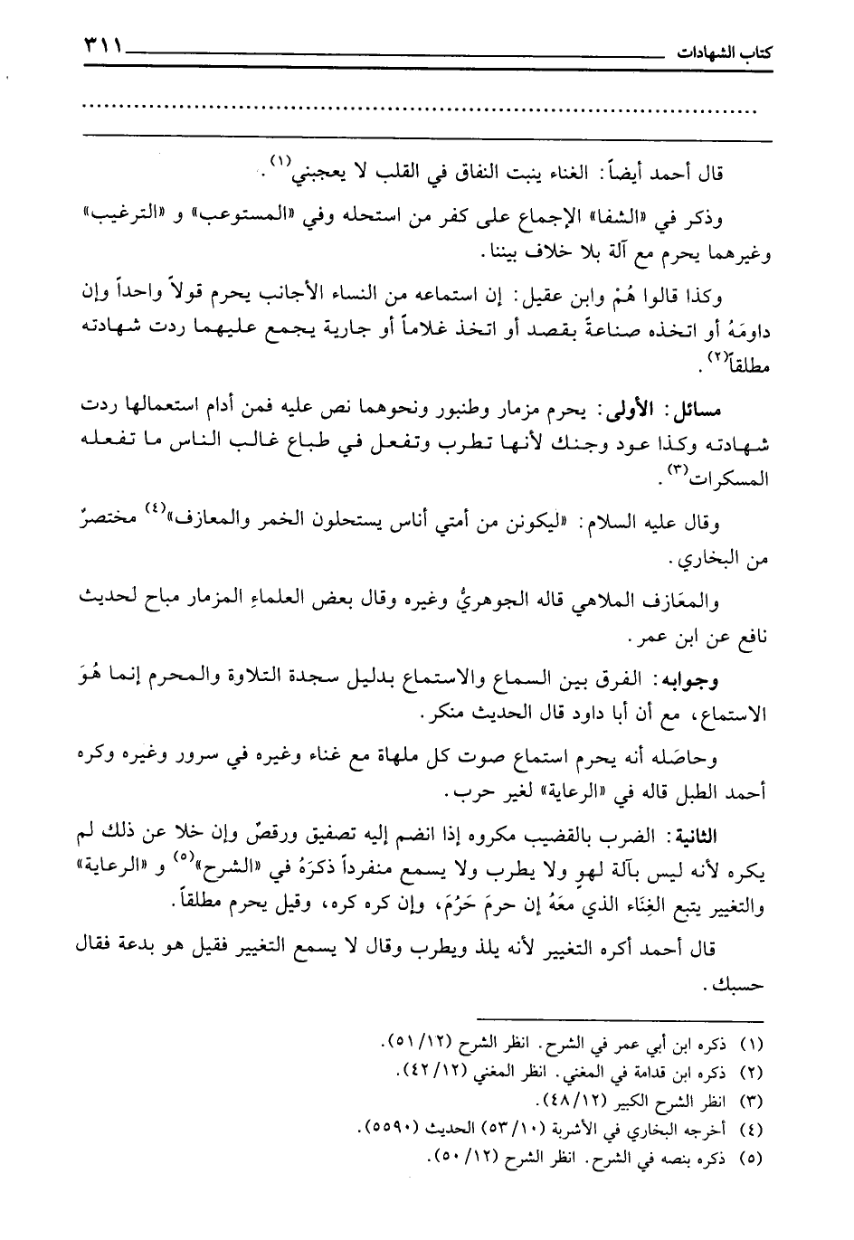مَسَائِلُ: الْأُولَى: يَحْرُمُ مِزْمَارٌ وَطُنْبُورٌ وَنَحْوُهُمَا، نَصَّ عَلَيْهِ، فَمَنْ أَدَامَ اسْتِعْمَالَهَا رُدَّتْ شَهَادَتُهُ، وَكَذَا عُودٌ وَجُنْكٌ؛ لِأَنَّهَا تُطْرِبُ وَتَفْعَلُ فِي طِبَاعِ غَالِبِ النَّاسِ مَا تَفْعَلُهُ الْمُسْكِرَاتُ.