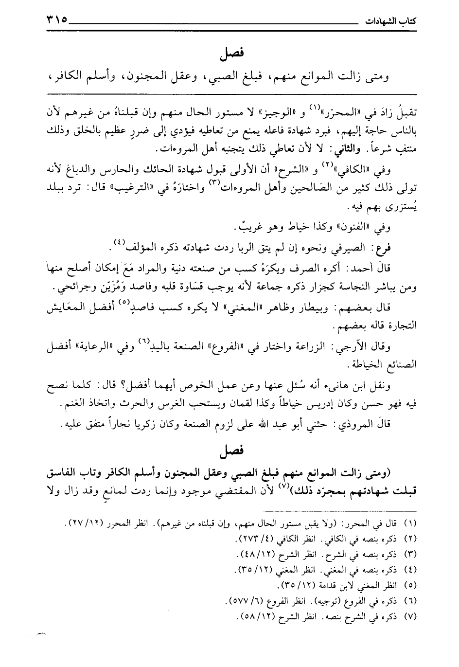 (وَمَتَّى زَالَتِ الْمَوَانِعُ مِنْهُمْ، فَبَلَغَ الصَّبِيُّ، وَعَقَلَ الْمَجْنُونُ، وَأَسْلَمَ الْكَافِرُ، وَتَابَ الْفَاسِقُ، قُبِلَتْ شَهَادَتُهُمْ بِمُجَرَّدِ ذَلِكَ) لِأَنَّ الْمُقْتَضِيَ مَوْجُودٌ، إِنَّمَا رُدَّتْ لِمَانِعٍ وَقَدْ زَالَ، وَلَا