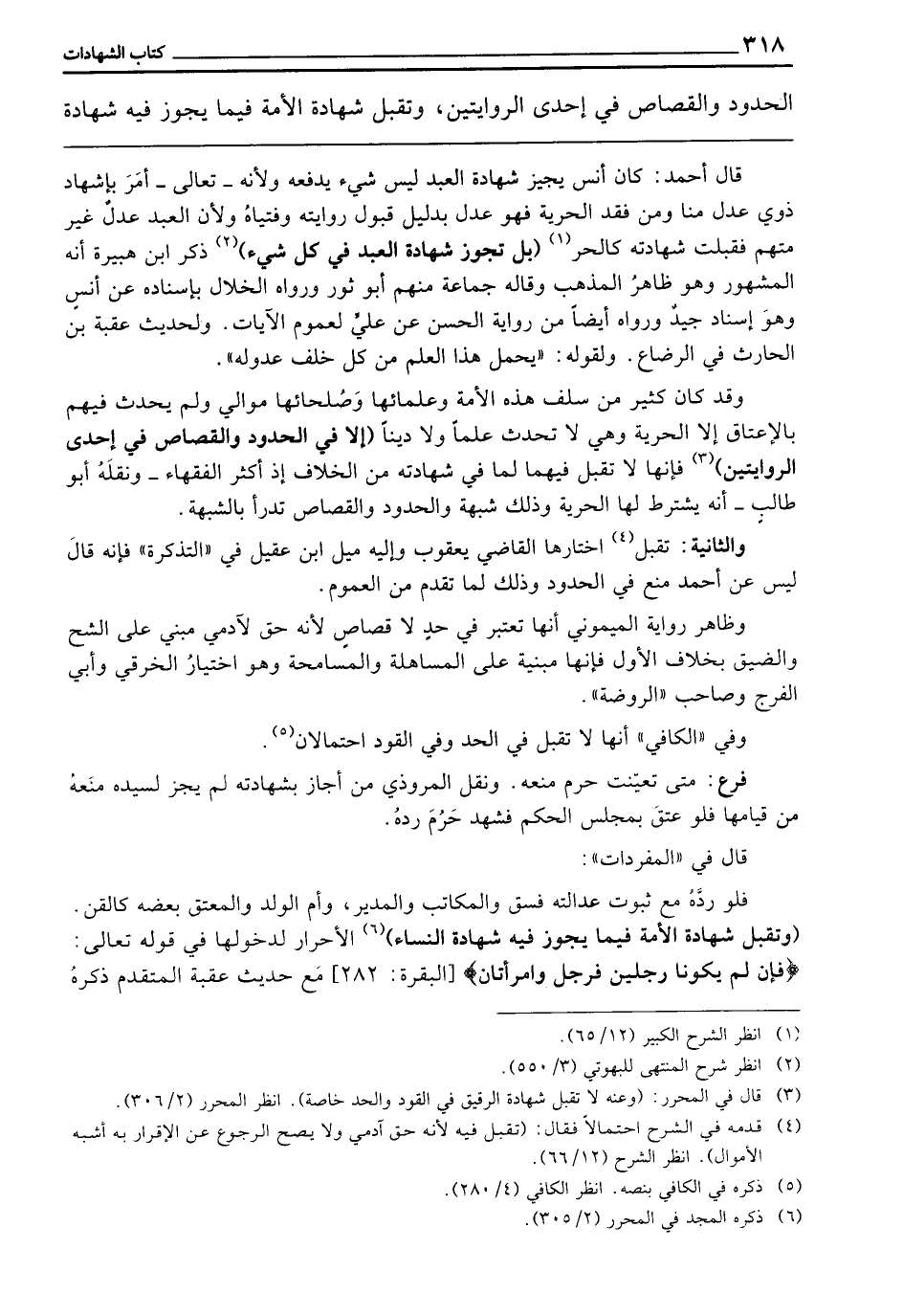 وَقَدْ كَانَ كَثِيرٌ مِنْ سَلَفِ هَذِهِ الْأُمَّةِ وَعُلَمَائِهَا وَصُلَحَائِهَا مَوَالِيَ، وَلَمْ يَحْدُثْ فِيهِمْ بِالْإِعْتَاقِ إِلَّا الْحُرِّيَّةُ، وَهِيَ لَا تَحْدُثُ عِلْمًا وَلَا دِينًا (إِلَّا فِي الْحُدُودِ وَالْقِصَاصِ فِي إِحْدَى الرِّوَايَتَيْنِ) فَإِنَّهَا لَا تُقْبَلُ فِيهِمَا؛ لِمَا فِي شَهَادَتِهِ مِنَ الْخِلَافِ، إِذْ أَكْثَرُ الْفُقَهَاءِ ـ وَنَقَلَهُ أَبُو طَالِبٍ ـ أَنَّهُ يُشْتَرَطُ لَهَا الْحُرِّيَّةُ، وَذَلِكَ شُبْهَةٌ، وَالْحُدُودُ وَالْقِصَاصُ تُدْرَأُ بِالشُّبْهَةِ.