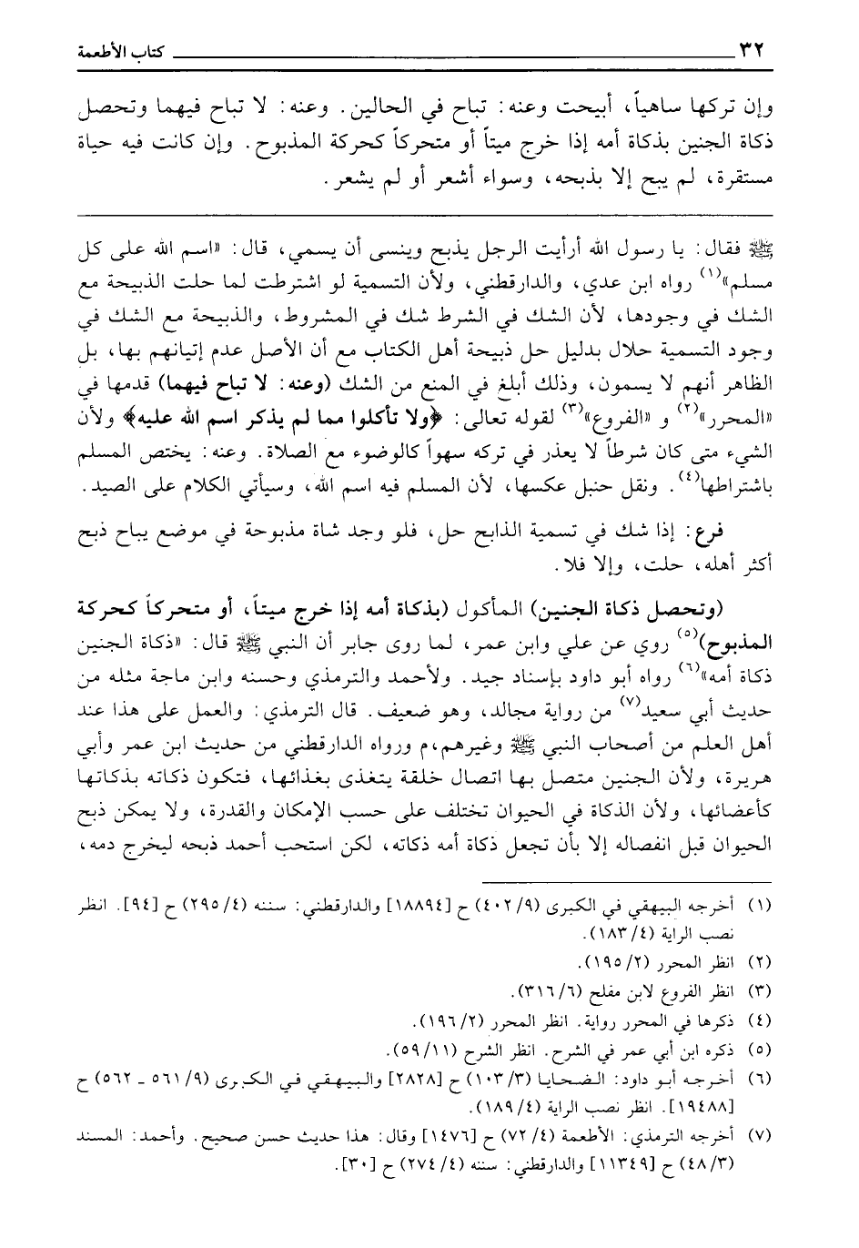 (وَتَحْصُلُ ذَكَاةُ الْجَنِينِ) الْمَأْكُولِ، (بِذَكَاةِ أُمِّهِ إِذَا خَرَجَ مَيِّتًا، أَوْ مُتَحَرِّكًا كَحَرَكَةِ الْمَذْبُوحِ) رُوِيَ عَنْ عَلِيٍّ، وَابْنِ عُمَرَ، لِمَا رَوَى جَابِرٌ أَنَّ النَّبِيَّ - صَلَّى اللَّهُ عَلَيْهِ وَسَلَّمَ - قَالَ: «ذَكَاةُ الْجَنِينِ ذَكَاةُ أُمِّهِ» . رَوَاهُ أَبُو دَاوُدَ بِإِسْنَادٍ جَيِّدٍ. وَلِأَحْمَدَ، وَالتِّرْمِذِيِّ، وَحَسَّنَهُ، وَابْنُ مَاجَهْ مِثْلَهُ مِنْ حَدِيثِ أَبِي سَعِيدٍ مِنْ رِوَايَةِ مُجَالِدٍ، وَهُوَ ضَعِيفٌ، قَالَ التِّرْمِذِيُّ: وَالْعَمَلُ عَلَى هَذَا عِنْدَ أَهْلِ الْعِلْمِ مِنْ أَصْحَابِ النَّبِيِّ - صَلَّى اللَّهُ عَلَيْهِ وَسَلَّمَ - وَغَيْرِهِمْ، وَرَوَاهُ الدَّارَقُطْنِيُّ مِنْ حَدِيثِ ابْنِ عُمَرَ وَأَبِي هُرَيْرَةَ، وَلِأَنَّ الْجَنِينَ مُتَّصِلٌ بِهَا اتِّصَالَ خِلْقَةٍ، يَتَغَذَّى بِغِذَائِهَا، فَتَكُونُ ذَكَاتُهُ بِذَكَاتِهَا كَأَعْضَائِهَا، وَلِأَنَّ الذَّكَاةَ فِي الْحَيَوَانِ تَخْتَلِفُ عَلَى حَسَبِ الْإِمْكَانِ وَالْقُدْرَةِ، وَلَا يُمْكِنُ ذَبْحُ الْحَيَوَانِ قَبْلَ انْفِصَالِهِ، إِلَّا بِأَنْ تُجْعَلَ ذَكَاةُ أُمِّهِ ذَكَاتَهُ، لَكِنِ اسْتَحَبَّ أَحْمَدُ ذَبْحَهُ لِيَخْرُجَ دَمُهُ،