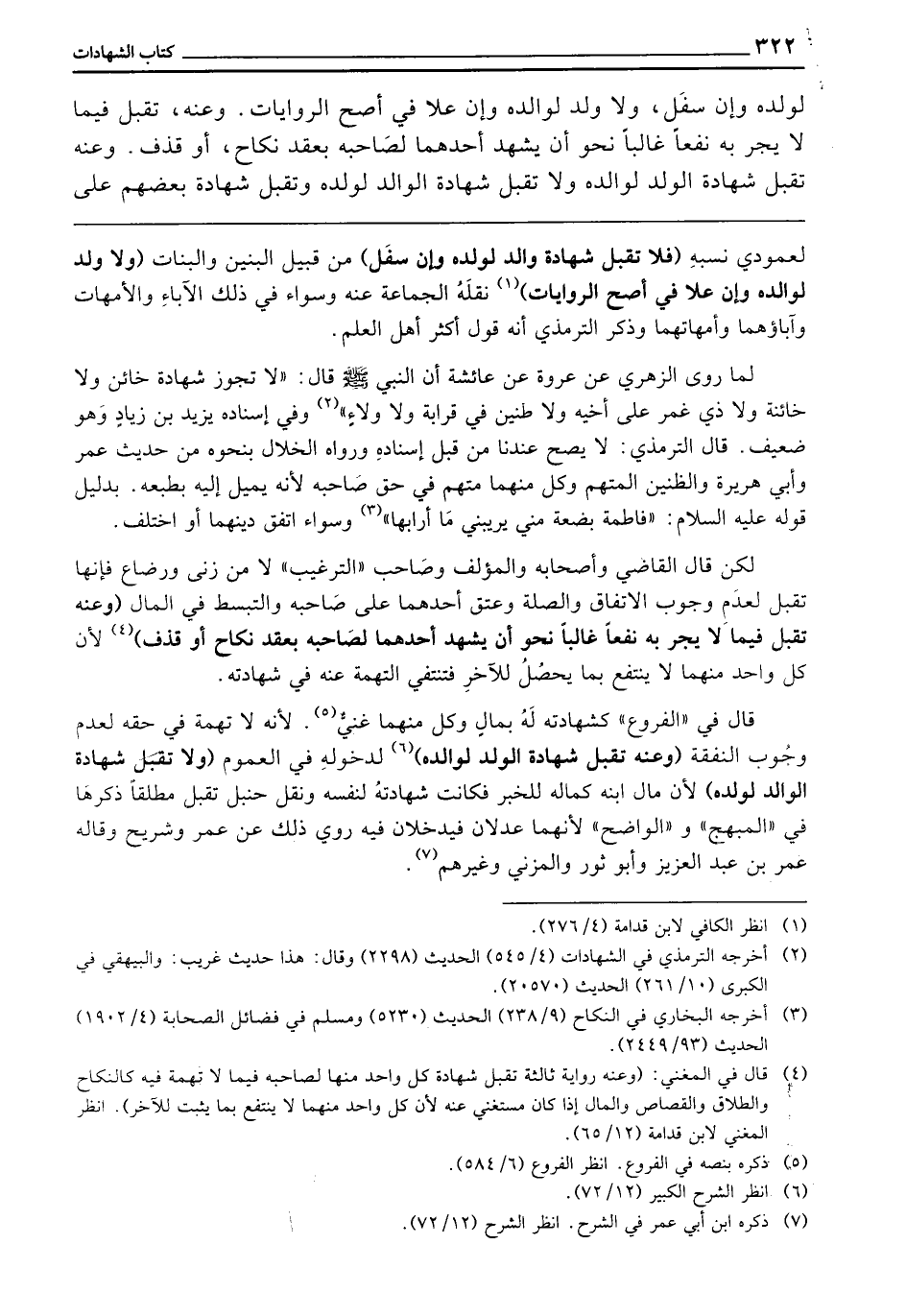 قَالَ فِي الْفُرُوعِ: كَشَهَادَتِهِ لَهُ بِمَالٍ وَكُلٌّ مِنْهُمَا غَنِيٌّ؛ لِأَنَّهُ لَا تُهْمَةَ فِي حَقِّهِ لِعَدَمِ وُجُوبِ النَّفَقَةِ (وَعَنْهُ: تُقْبَلُ شَهَادَةُ الْوَلَدِ لِوَالِدِهِ) لِدُخُولِهِ فِي الْعُمُومِ (وَلَا تُقْبَلُ شَهَادَةُ الْوَالِدِ لِوَلَدِهِ) لِأَنَّ مَالَ ابْنِهِ كَمَالِهِ لِلْخَبَرِ، فَكَانَتْ شَهَادَتُهُ لِنَفْسِهِ، وَنَقَلَ حَنْبَلٌ: تُقْبَلُ مُطْلَقًا، ذَكَرَهَا فِي الْمُبْهِجِ وَالْوَاضِحِ؛ لِأَنَّهُمَا عَدْلَانِ فَيَدْخُلَانِ فِيهِ، رُوِيَ ذَلِكَ عَنْ عُمَرَ وَشُرَيْحٍ، وَقَالَهُ عُمَرُ بْنُ عَبْدِ الْعَزِيزِ وَأَبُو ثَوْرٍ وَالْمُزَنِيُّ وَغَيْرُهُمْ.
