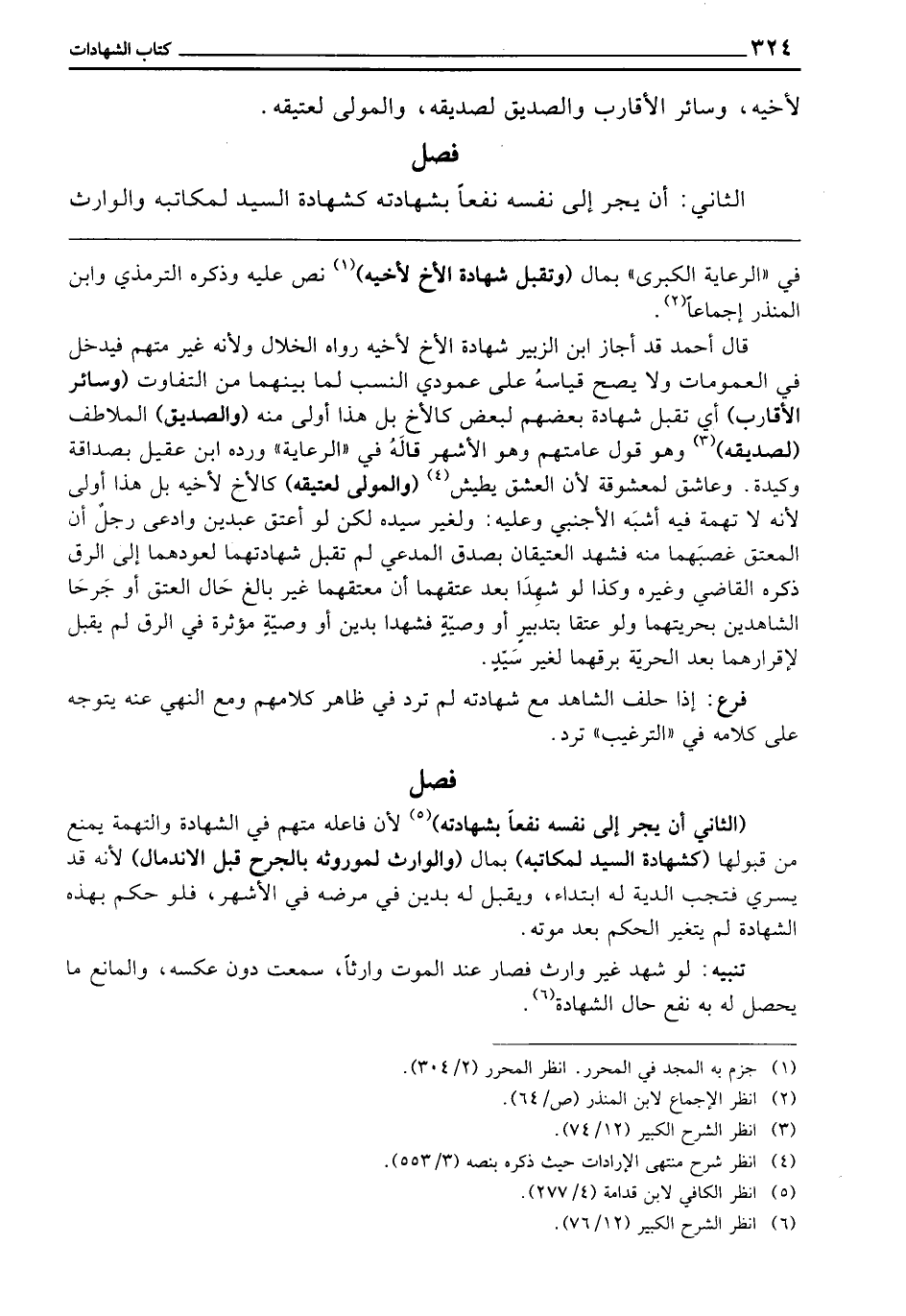 الثَّانِي: أَنْ يَجُرَّ إِلَى نَفْسِهِ نَفْعًا بِشَهَادَتِهِ كَشَهَادَةِ السَّيِّدِ لِمُكَاتَبِهِ، وَالْوَارِثِ