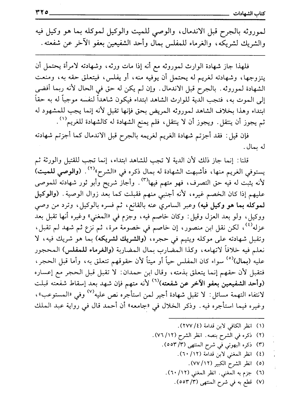قُلْنَا: إِنَّمَا جَازَ ذَلِكَ؛ لِأَنَّ الدِّيَةَ لَا تَجِبُ لِلشَّاهِدِ ابْتِدَاءً، إِنَّمَا تَجِبُ لِلْقَتِيلِ وَالْوَرَثَةِ ثُمَّ يَسْتَوْفِي الْغَرِيمُ مِنْهَا، فَأَشْبَهَتِ الشَّهَادَةَ لَهُ بِمَالٍ، ذَكَرَهُ فِي الشَّرْحِ (وَالْوَصِيِّ لِلْمَيِّتِ) لِأَنَّهُ يَثْبُتُ لَهُ فِيهِ حَقُّ التَّصَرُّفِ، فَهُوَ مُتَّهَمٌ فِيهَا، وَأَجَازَ شُرَيْحٌ وَأَبُو ثَوْرٍ شَهَادَتَهُ لِلْمُوصَى عَلَيْهِمْ إِذَا كَانَ الْخَصْمُ غَيْرَهُ، لِأَنَّهُ أَجْنَبِيٌّ مِنْهُمْ، فَقُبِلَتْ كَمَا بَعْدَ زَوَالِ الْوَصِيَّةِ، (وَالْوَكِيلِ لِمُوَكِّلِهِ بِمَا هُوَ وَكِيلٌ فِيهِ) وَعَبَّرَ السَّامَرِّيُّ عَنْهُ بِالْقَانِعِ، ثُمَّ فَسَّرَهُ بِالْوَكِيلِ، وَتُرَدُّ مِنْ وَصِيٍّ وَوَكِيلٍ وَلَوْ بَعْدَ الْعَزْلِ. وَقِيلَ: وَكَانَ خَاصَمَ فِيهِ، وَجَزَمَ فِي الْمُغْنِي وَغَيْرِهِ: أَنَّهَا تقبل بَعْدَ عَزْلِهِ، لَكِنْ نَقَلَ ابْنُ مَنْصُورٍ: إِنْ خَاصَمَ فِي خُصُومَةٍ مَرَّةً، ثُمَّ نَزَعَ، ثُمَّ شَهِدَ لَمْ تُقْبَلْ، وَتُقْبَلُ شَهَادَتُهُ عَلَى مُوَكِّلِهِ، وَيَتِيمٌ فِي حِجْرِهِ، (وَالشَّرِيكِ لِشَرِيكِهِ) بِمَا هُوَ شَرِيكٌ فِيهِ، لَا نَعْلَمُ فِيهِ خِلَافًا لِاتِّهَامِهِ، وَكَذَا الْمُضَارِبُ بِمَالِ الْمُضَارَبَةِ (وَالْغُرَمَاءِ لِلْمُفْلِسِ) الْمَحْجُورِ عَلَيْهِ (بِمَالٍ) سَوَاءٌ كَانَ الْمُفْلِسُ حَيًّا أَوْ مَيِّتًا؛ لِأَنَّ حُقُوقَهُمْ تَتَعَلَّقُ بِهِ، وَأَمَّا قَبْلَ الْحَجْرِ فَتُقْبَلُ؛ لِأَنَّ حَقَّهُمْ إِنَّمَا يَتَعَلَّقُ بِذِمَّتِهِ، وَقَالَ ابْنُ حَمْدَانَ: لَا تُقْبَلُ قَبْلَ الْحَجْرِ مَعَ إِعْسَارِهِ، (وَأَحَدُ الشَّفِيعَيْنِ بِعَفْوِ الْآخَرِ عَنْ شُفْعَتِهِ) لِأَنَّهُ مُتَّهَمٌ، فَإِنْ شَهِدَ بَعْدَ إِسْقَاطِ شُفْعَتِهِ قُبِلَتْ؛ لِانْتِفَاءِ التُّهْمَةِ.