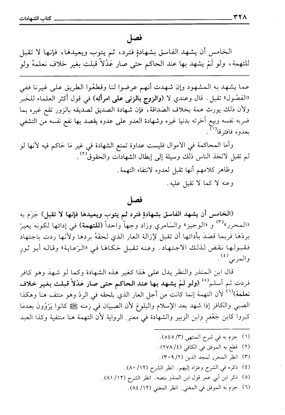 (الْخَامِسُ: أَنْ يَشْهَدَ الْفَاسِقُ بِشَهَادَةٍ فَتُرَدُّ، ثُمَّ يَتُوبُ وَيُعِيدُهَا فَإِنَّهَا لَا تُقْبَلُ) جَزَمَ بِهِ الْمُحَرَّرُ وَالْوَجِيزُ وَالسَّامَرِّيُّ، وَزَادَ وَجْهًا وَاحِدًا (لِلتُّهْمَةِ) فِي أَدَائِهَا لِكَوْنِهِ يُعَيَّرُ بِرَدِّهَا، فَرُبَّمَا قَصَدَ بِأَدَائِهَا أَنْ تُقْبَلَ لِإِزَالَةِ الْعَارِ الَّذِي لَحِقَهُ بِرَدِّهَا، وَلِأَنَّهَا رُدَّتْ بِاجْتِهَادٍ فَقَبُولُهَا نَقْضٌ لِذَلِكَ الِاجْتِهَادِ، وَعَنْهُ: تُقْبَلُ، حَكَاهَا فِي الرِّعَايَةِ، وَقَالَهُ أَبُو ثَوْرٍ وَالْمُزَنِيُّ.