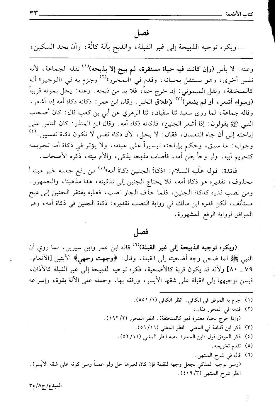 فَصْلٌ (وَيُكْرَهُ تَوْجِيهُ الذَّبِيحَةِ إِلَى غَيْرِ الْقِبْلَةِ) قَالَهُ ابْنُ عُمَرَ وَابْنُ سِيرِينَ، لِمَا رُوِيَ «أَنَّ النَّبِيَّ - صَلَّى اللَّهُ عَلَيْهِ وَسَلَّمَ - لَمَّا ضَحَّى وَجَّهَ أُضْحِيَتَهُ إِلَى الْقِبْلَةِ، وَقَالَ: {وَجَّهْتُ وَجْهِيَ} [الأنعام: 79] » الْآيَتَيْنِ، وَلِأَنَّهُ قَدْ يَكُونُ قُرْبَةً كَالْأُضْحِيَّةِ، فَكُرِهَ تَوْجِيهُ الذَّبِيحَةِ إِلَى غَيْرِ الْقِبْلَةِ كَالْأَذَانِ، فَيُسَنُّ تَوْجِيهُهَا إِلَى الْقِبْلَةِ عَلَى شِقِّهَا الْأَيْسَرِ، وَرِفْقُهُ بِهَا، وَحَمْلُهُ عَلَى الْآلَةِ بِقُوَّةٍ، وَإِسْرَاعُهُ