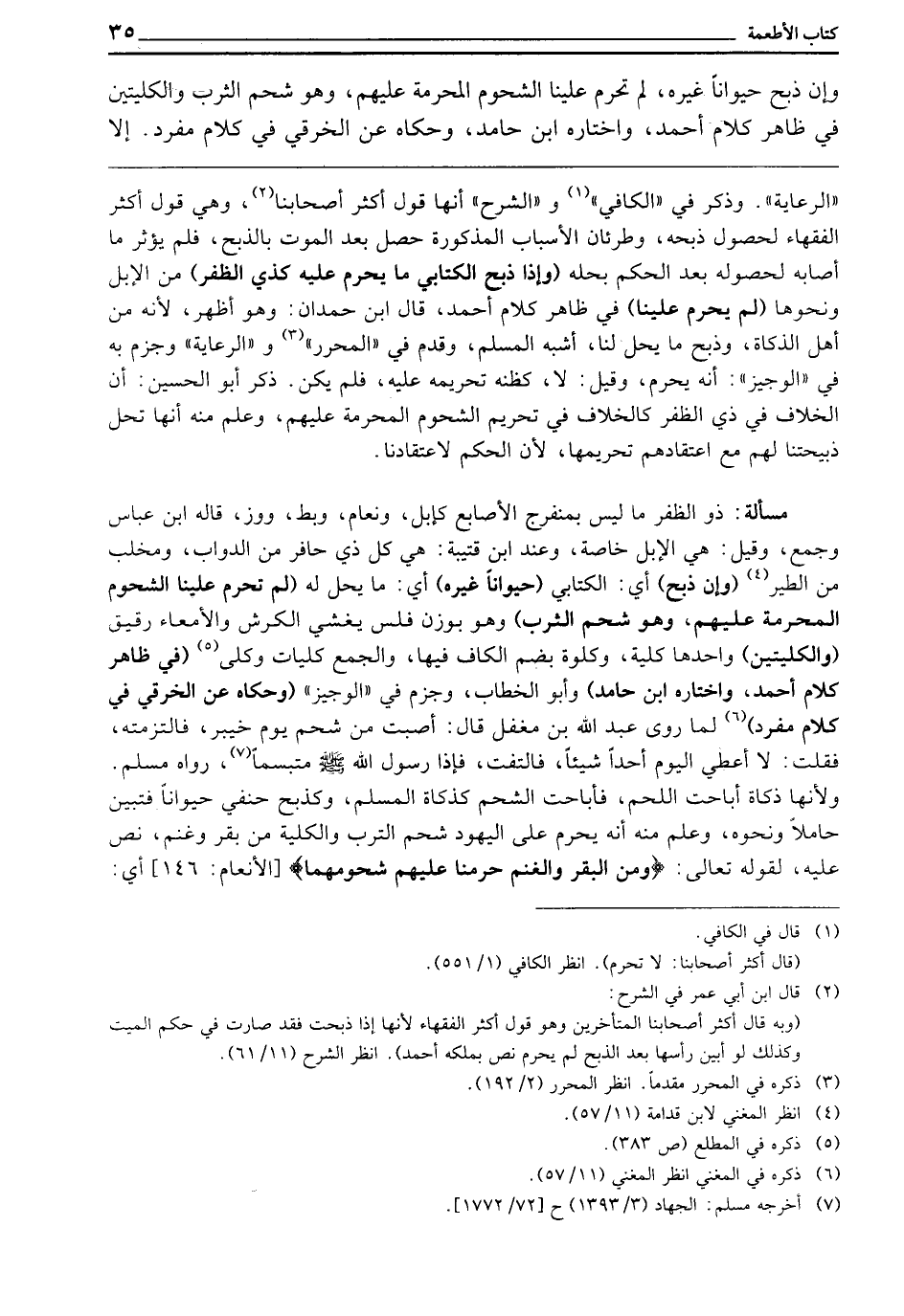 مَسْأَلَةٌ: ذُو الظُّفُرِ مَا لَيْسَ بِمُنْفَرِجِ الْأَصَابِعِ، كَإِبِلٍ وَنَعَامٍ وَبَطٍّ وَوَزٍّ، قَالَهُ ابْنُ عَبَّاسٍ وَجُمِعَ، وَقِيلَ: هِيَ الْإِبِلُ خَاصَّةً، وَعِنْدَ ابْنِ قُتَيْبَةَ: هِيَ كُلُّ ذِي حَافِرٍ مِنَ الدَّوَابِّ، وَمِخْلَبٍ مِنَ الطَّيْرِ، (وَإِنْ ذَبَحَ) أَيِ: الْكِتَابِيُّ، (حَيَوَانًا غَيْرَهُ) أَيْ: مَا يَحِلُّ لَهُ، (لَمْ تَحْرُمْ عَلَيْنَا الشُّحُومُ الْمُحَرَّمَةُ عَلَيْهِمْ، وَهُوَ شَحْمُ الثَّرْبِ) وَهُوَ بِوَزْنِ فَلْسٍ، يُغْشِي الْكِرْشَ وَالْأَمْعَاءَ رَقِيقٌ، (وَالْكُلْيَتَيْنِ) وَاحِدُهَا كُلْيَةٌ وَكُلْوَةٌ، بِضَمِّ الْكَافِ فِيهَا، وَالْجَمْعُ: كُلْيَاتٌ وَكُلًى، (فِي ظَاهِرِ كَلَامِ أَحْمَدَ، وَاخْتَارَهُ ابْنُ حَامِدٍ) وَأَبُو الْخَطَّابِ، وَجَزَمَ بِهِ فِي الْوَجِيزِ (وَحَكَاهُ عَنِ الْخِرَقِيِّ فِي كَلَامٍ مُفْرَدٍ) لِمَا «رَوَى عَبْدُ اللَّهِ بْنُ مُغَفَّلٍ، قَالَ: أَصَبْتُ مِنْ شَحْمِ يَوْمِ خَيْبَرَ فَالْتَزَمْتُهُ، فَقُلْتُ: لَا أُعْطِي الْيَوْمَ أَحَدًا شَيْئًا، فَالْتَفَتُّ فَإِذَا رَسُولُ اللَّهِ - صَلَّى اللَّهُ عَلَيْهِ وَسَلَّمَ - مُتَبَسِّمًا» . رَوَاهُ مُسْلِمٌ. وَلِأَنَّهَا ذَكَاةٌ أَبَاحَتِ اللَّحْمَ فَأَبَاحَتِ الشَّحْمَ، كَذَكَاةِ الْمُسْلِمِ، وَكَذَبْحِ حَنَفِيٍّ حَيَوَانًا فَتَبَيَّنَ حَامِلًا وَنَحْوَهُ، وَعُلِمَ مِنْهُ أَنَّهُ يَحْرُمُ عَلَى الْيَهُودِ شَحْمُ الثَّرْبِ وَالْكُلْيَةِ مِنْ بَقَرٍ وَغَنَمٍ، نَصَّ عَلَيْهِ، لِقَوْلِهِ تَعَالَى: {وَمِنَ الْبَقَرِ وَالْغَنَمِ حَرَّمْنَا عَلَيْهِمْ شُحُومَهُمَا} [الأنعام: 146] أَيْ: