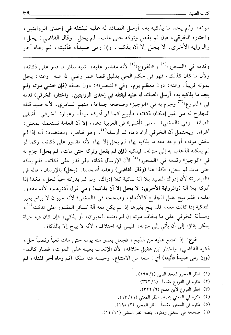 ـــــــــــــــــــــــــــــQوَقَدَّمَهُ فِي الْمُحَرَّرِ وَالْفُرُوعِ، لِأَنَّهُ مَقْدُورٌ عَلَيْهِ، أَشْبَهَ سَائِرَ مَا قُدِرَ عَلَى ذَكَاتِهِ، وَلِأَنَّ مَا كَانَ كَذَلِكَ فَهُوَ فِي حُكْمِ الْحَيِّ، بِدَلِيلِ قِصَّةِ عُمَرَ - رَضِيَ اللَّهُ عَنْهُ -، وَعَنْهُ: يَحِلُّ بِمَوْتِهِ قَرِيبًا، وَعَنْهُ: دُونَ مُعْظَمِ يَوْمٍ، وَفِي التَّبْصِرَةِ: دُونَ نِصْفِهِ، (فَإِنْ خَشِيَ مَوْتَهُ وَلَمْ يَجِدْ مَا يُذَكِّيهِ بِهِ أَرْسَلَ الصَّائِدَ لَهُ عَلَيْهِ لِيَقْتُلَهُ، فِي إِحْدَى الرِّوَايَتَيْنِ، وَاخْتَارَهُ الْخِرَقِيُّ) قَدَّمَهُ فِي الْفُرُوعِ، وَجَزَمَ بِهِ فِي الْوَجِيزِ، وَصَحَّحَهُ جَمَاعَةٌ مِنْهُمُ السَّامِرِيُّ، لِأَنَّهُ صَيْدٌ قَتَلَهُ الْجَارِحُ لَهُ مِنْ غَيْرِ إِمْكَانِ ذَكَاتِهِ فَأُبِيحَ، كَمَا لَوْ أَدْرَكَهُ مَيِّتًا، وَعِبَارَةُ الْخِرَقِيُّ: أَشْلَى الصَّائِدَ، وَفِي الْمُغْنِي: مَعْنَى أَشْلَى فِي الْعَرَبِيَّةِ: دَعَاهُ، إِلَّا أَنَّ الْعَامَّةَ تَسْتَعْمِلُهُ بِمَعْنَى: أَغْرَاهُ، وَيُحْتَمَلُ أَنَّ الْخِرَقِيَّ أَرَادَ دَعَاهُ، ثُمَّ أَرْسَلَهُ، وَهُوَ ظَاهِرٌ، وَمُقْتَضَاهُ: أَنَّهُ إِذَا لَمْ يَخْشَ مَوْتَهُ أَوْ وَجَدَ مَعَهُ مَا يُذَكِّيهِ بِهَا لَمْ يَحِلَّ إِلَّا بِهَا، لِأَنَّهُ مَقْدُورٌ عَلَى ذَكَاتِهِ، وَكَمَا لَوْ لَمْ يُمْكِنْهُ الذَّهَابُ بِهِ إِلَى مَنْزِلِهِ فَيُذَكِّيَهِ، (فَإِنْ لَمْ يَفْعَلْ وَتَرَكَهُ حَتَّى مَاتَ، لَمْ يَحِلَّ) جَزَمَ بِهِ فِي الْوَجِيزِ، وَقَدَّمَهُ فِي الْمُحَرَّرِ، لِأَنَّ الْإِرْسَالَ ذَكَاةٌ، وَلَوْ قَدَرَ عَلَى ذَكَاتِهِ فَلَمْ يُذَكِّهِ حَتَّى مَاتَ لَمْ يَحِلَّ فَكَذَا هُنَا، (وَقَالَ الْقَاضِي) وَعَامَّةُ أَصْحَابِنَا: (يَحِلُّ) بِالْإِرْسَالِ، قَالَهُ فِي التَّبْصِرَةِ، لِأَنَّ إِدْرَاكَ الصَّيْدِ بِلَا آلَةٍ تَذْكِيَةٌ كَلَا إِدْرَاكٍ، وَلَوْ لَمْ يُدْرِكْهُ حَيًّا لَحَلَّ، فَكَذَا إِذَا أَدْرَكَهُ بِلَا آلَةٍ، (وَالرِّوَايَةُ الْأُخْرَى: لَا يَحِلُّ إِلَّا أَنْ يُذَكِّيَهُ) وَهِيَ قَوْلُ أَكْثَرِهِمْ، لِأَنَّهُ مَقْدُورٌ عَلَيْهِ فَلَمْ يُبَحْ بِقَتْلِ الْجَارِحِ كَالْأَنْعَامِ، وَصَحَّحَهُ فِي الْمُغْنِي لِأَنَّهُ حَيَوَانٌ لَا يُبَاحُ بِغَيْرِ التَّذْكِيَةِ، إِذَا كَانَتْ مَعَهُ فَلَمْ يُبَحْ بِغَيْرِهَا، إِذَا لَمْ يَكُنْ مَعَهُ آلَةٌ كَسَائِرٍ الْمَقْدُورِ عَلَى تَذْكِيَتِهِ، وَمَسْأَلَةُ الْخِرَقِيِّ عَلَى مَا يَخَافُ مَوْتَهُ إِنْ لَمْ يَقْتُلْهُ الْحَيَوَانُ أَوْ يُذَكّى، فَإِنْ كَانَ فِيهِ حَيَاةٌ يُمْكِنُ بَقَاؤُهُ إِلَى أَنْ يَأْتِيَ إِلَى مَنْزِلِهِ فَلَيْسَ فِيهِ اخْتِلَافٌ، لِأَنَّهُ لَا يُبَاحُ إِلَّا بِالذَّكَاةِ.