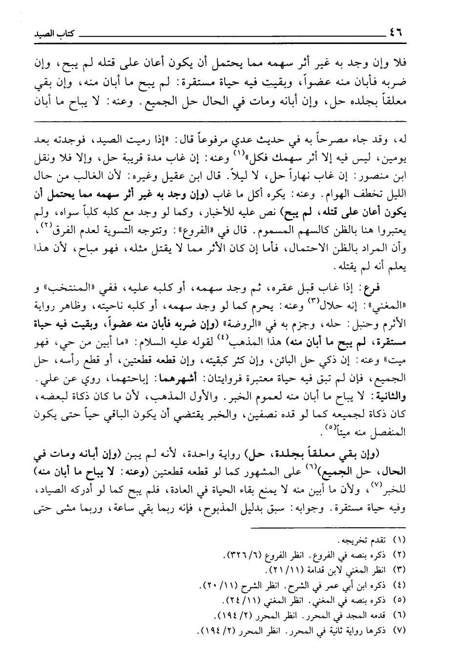 فَرْعٌ: إِذَا غَابَ قَبْلَ عَقْرِهِ، ثُمَّ وَجَدَ سَهْمَهُ أَوْ كَلْبَهُ عَلَيْهِ، فَفِي الْمُنْتَخَبِ وَالْمُغْنِي: إِنَّهُ حَلَالٌ، وَعَنْهُ: يَحْرُمُ كَمَا لَوْ وَجَدَ سَهْمَهُ أَوْ كَلْبَهُ نَاحِيَتَهُ، وَظَاهِرُ رِوَايَةِ الْأَثْرَمِ وَحَنْبَلٍ حِلُّهُ، وَجَزَمَ بِهِ فِي الرَّوْضَةِ، (وَإِنْ ضَرَبَهُ فَأَبَانَ مِنْهُ عُضْوًا وَبَقِيَتْ فِيهِ حَيَاةٌ مُسْتَقِرَّةٌ، لَمْ يُبَحْ مَا أَبَانَ مِنْهُ) هَذَا الْمَذْهَبُ، لِقَوْلِهِ - عَلَيْهِ السَّلَامُ -: «مَا أُبِينَ مِنْ حَيٍّ فَهُوَ مَيِّتٌ» . وَعَنْهُ: إِنْ ذُكِّيَ حَلَّ الْبَائِنُ، وَإِنْ كَثُرَ كَبَقِيَّتِهِ، وَإِنْ قَطَعَهُ قِطْعَتَيْنِ، أَوْ قَطَعَ رَأْسَهُ، حَلَّ الْجَمِيعُ، فَإِنْ لَمْ تَبْقَ فِيهِ حَيَاةٌ مُعْتَبَرَةٌ فَرِوَايَتَانِ، أَشْهَرُهُمَا: إِبَاحَتُهُمَا، رُوِيَ عَنْ عَلِيٍّ، وَالثَّانِيَةُ: لَا يُبَاحُ مَا أَبَانَ مِنْهُ، لِعُمُومِ الْخَبَرِ، وَالْأَوَّلُ الْمَذْهَبُ، لِأَنَّ مَا كَانَ ذَكَاةً لِبَعْضِهِ كَانَ ذَكَاةً لِجَمِيعِهِ، كَمَا لَوْ قَدَّهُ نِصْفَيْنِ، وَالْخَبَرُ يَقْتَضِي أَنْ يَكُونَ الْبَاقِي حَيًّا حَتَّى يَكُونَ الْمُنْفَصِلُ مِنْهُ مَيِّتًا.