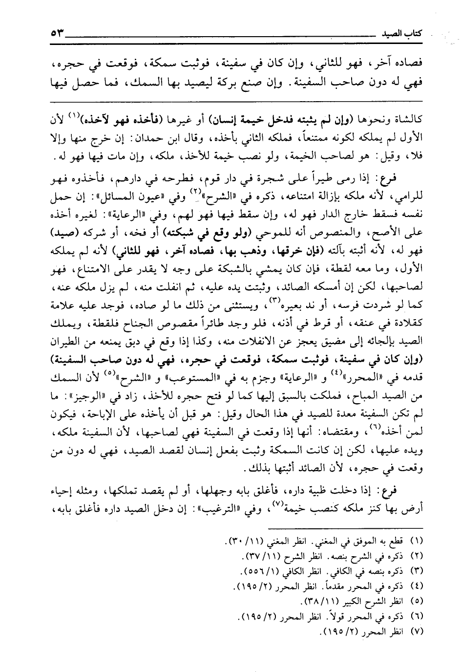 فَرْعٌ: إِذَا رَمَى طَيْرًا عَلَى شَجَرَةٍ فِي دَارِ قَوْمٍ، فَطَرَحَهُ فِي دَارِهِمْ فَأَخَذُوهُ، فَهُوَ لِلرَّامِي، لِأَنَّهُ مَلَكَهُ بِإِزَالَةِ امْتِنَاعِهِ، ذَكَرَهُ فِي الشَّرْحِ وَفِي عُيُونِ الْمَسَائِلِ: إِنْ حَمَلَ نَفْسَهُ فَسَقَطَ خَارِجَ الدَّارِ، فَهُوَ لَهُ، وَإِنْ سَقَطَ فِيهَا فَهُوَ لَهُمْ. وَفِي الرِّعَايَةِ: لِغَيْرِهِ أَخْذُهُ عَلَى الْأَصَحِّ، وَالْمَنْصُوصُ أَنَّهُ لِلْمُوحِي، (وَلَوْ وَقَعَ فِي شَبَكَتِهِ) أَوْ فَخِّهِ أَوْ شَرَكِهِ (صَيْدٌ) فَهُوَ لَهُ، لِأَنَّهُ أَثْبَتَهُ بِآلَتِهِ (فَإِنْ خَرَقَهَا، وَذَهَبَ بِهَا، فَصَادَهُ آخَرُ، فَهُوَ لِلثَّانِي) لِأَنَّهُ لَمْ يَمْلِكْهُ الْأَوَّلُ، وَمَا مَعَهُ لُقَطَةٌ، فَإِنْ كَانَ يَمْشِي بِالشَّبَكَةِ عَلَى وَجْهٍ لَا يَقْدِرُ عَلَى الِامْتِنَاعِ، فَهُوَ لِصَاحِبِهَا، لَكِنْ إِنْ أَمْسَكَهُ الصَّائِدُ وَثَبَتَتْ يَدُهُ عَلَيْهِ، ثُمَّ انْفَلَتَ مِنْهُ، لَمْ يَزَلْ مِلْكُهُ عَنْهُ، كَمَا لَوْ شَرَدَتْ فَرَسُهُ، أَوْ نَدَّ بَعِيرُهُ، وَيُسْتَثْنَى مِنْ ذَلِكَ مَا لَوْ صَادَهُ فَوَجَدَ عَلَيْهِ عَلَامَةً كَقِلَادَةٍ فِي عُنُقِهِ أَوْ قُرْطٍ فِي أُذُنِهِ، فَلَوْ وَجَدَ طَائِرًا مَقْصُوصَ الْجَنَاحِ فَلُقَطَةٌ، وَيَمْلِكُ الصَّيْدَ بِإِلْجَائِهِ إِلَى مَضِيقٍ يَعْجِزُ عَنِ الِانْفِلَاتِ مِنْهُ، وَكَذَا إِذَا وَقَعَ فِي دِبْقٍ يمنعه مِنَ الطَّيَرَانِ، (وَإِنْ كَانَ فِي سَفِينَةٍ فَوَثَبَتْ سَمَكَةٌ فَوَقَعَتْ فِي حِجْرِهِ، فَهِيَ لَهُ دُونَ صَاحِبِ السَّفِينَةِ) قَدَّمَهُ فِي الْمُحَرَّرِ وَالرِّعَايَةِ، وَجَزَمَ بِهِ فِي الْمُسْتَوْعِبِ وَالشَّرْحِ، لِأَنَّ السَّمَكَ مِنَ الصَّيْدِ الْمُبَاحِ، فَمُلِكَتْ بِالسَّبْقِ إِلَيْهَا، كَمَا لَوْ فَتَحَ حِجْرَهُ لِلْأَخْذِ، زَادَ فِي الْوَجِيزِ: مَا لَمْ تَكُنِ السَّفِينَةُ مُعَدَّةً لِلصَّيْدِ، فِي هَذَا الْحَالِ، وَقِيلَ: هُوَ قَبْلَ أَنْ يَأْخُذَهُ عَلَى الْإِبَاحَةِ، فَيَكُونَ لِمَنْ أَخَذَهُ، وَمُقْتَضَاهُ: أَنَّهَا إِذَا وَقَعَتْ في السفينة فَهِيَ لِصَاحِبِهَا، لِأَنَّ السَّفِينَةَ مِلْكُهُ، وَيَدُهُ عَلَيْهَا، لَكِنْ إِنْ كَانَتِ السَّمَكَةُ وَثَبَتْ بِفِعْلِ إِنْسَانٍ لِقَصْدِ الصَّيْدِ فَهِيَ لَهُ دُونَ مَنْ وَقَعَتْ فِي حِجْرِهِ، لِأَنَّ الصَّائِدَ أَثْبَتَهَا بِذَلِكَ.