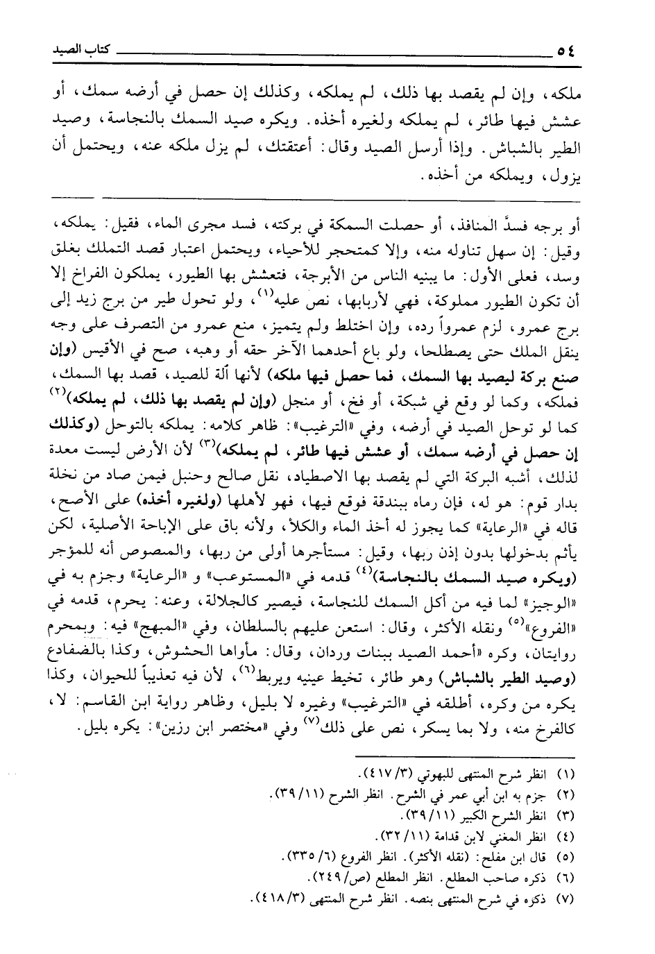 ـــــــــــــــــــــــــــــQأَوْ بُرْجَهُ، فَسَدَّ الْمَنَافِذَ، أَوْ حَصَلَتِ السَّمَكَةُ فِي بِرْكَتِهِ، فَسَدَّ مَجْرَى الْمَاءِ، فَقِيلَ: يَمْلِكُهُ، وَقِيلَ: إِنْ سَهُلَ تَنَاوُلُهُ مِنْهُ، وَإِلَّا كَمُتَحَجِّرٍ لِلْأَحْيَاءِ، وَيُحْتَمَلُ اعْتِبَارُ قَصْدِ التَّمَلُّكِ بِغَلْقٍ وَسَدٍّ، فَعَلَى الْأَوَّلِ: مَا يَبْنِيهِ النَّاسُ مِنَ الْأَبْرِجَةِ، فَتُعَشْعِشُ بِهَا الطُّيُورُ يَمْلِكُونَ الْفِرَاخَ، إِلَّا أَنْ تَكُونَ الطُّيُورُ مَمْلُوكَةً، فَهِيَ لِأَرْبَابِهَا، نَصَّ عَلَيْهِ، وَلَوْ تَحَوَّلَ طَيْرٌ مِنْ بُرْجِ زَيْدٍ إِلَى بُرْجِ عَمْرٍو، لَزِمَ عَمْرًا رَدُّهُ، وَإِنِ اخْتَلَطَ وَلَمْ يَتَمَيَّزْ مُنِعَ عَمْرٌو مِنَ التَّصَرُّفِ عَلَى وَجْهٍ يَنْقُلُ الْمِلْكَ حَتَّى يَصْطَلِحَا، وَلَوْ بَاعَ أَحَدُهُمَا الْآخَرَ حَقَّهُ، أَوْ وَهَبَهُ، صَحَّ فِي الْأَقْيَسِ (وَإِنْ صَنَعَ بِرْكَةً لِيَصِيدَ بِهَا السَّمَكَ، فَمَا حَصَلَ فِيهَا مَلَكَهُ) لِأَنَّهَا آلَةٌ لِلصَّيْدِ، قَصَدَ بِهَا السَّمَكَ فَمَلَكَهُ، وَكَمَا لَوْ وَقَعَ فِي شَبَكَةٍ، أَوْ فَخٍّ، أَوْ مِنْجَلٍ (وَإِنْ لَمْ يَقْصِدْ بِهَا ذَلِكَ لَمْ يَمْلِكْهُ) كَمَا لَوْ تَوَحَّلَ الصَّيْدُ فِي أَرْضِهِ، وَفِي التَّرْغِيبِ: ظَاهِرُ كَلَامِهِ: يَمْلِكُهُ بِالتَّوَحُّلِ (وَكَذَلِكَ إِنْ حَصَلَ فِي أَرْضِهِ سَمَكٌ، أَوْ عَشَّشَ فِيهَا طَائِرٌ لَمْ يَمْلِكْهُ) لِأَنَّ الْأَرْضَ لَيْسَتْ مُعَدَّةً لِذَلِكَ، أَشْبَهَ الْبِرْكَةَ الَّتِي لَمْ يُقْصَدْ بِهَا الِاصْطِيَادُ، نَقَلَ صَالِحٌ وَحَنْبَلٌ، فِيمَنْ صَادَ مِنْ نَخْلَةٍ بِدَارِ قَوْمٍ: هُوَ لَهُ، فَإِنْ رَمَاهُ بِبُنْدُقَةٍ فَوَقَعَ فِيهَا فَهُوَ لِأَهْلِهَا، (وَلِغَيْرِهِ أَخْذُهُ) عَلَى الْأَصَحِّ، قَالَهُ فِي الرِّعَايَةِ، كَمَا يَجُوزُ لَهُ أَخْذُ الْمَاءِ وَالْكَلَأِ، وَلِأَنَّهُ بَاقٍ عَلَى الْإِبَاحَةِ الْأَصْلِيَّةِ، لَكِنْ يَأْثَمُ بِدُخُولِهَا بِدُونِ إِذْنِ رَبِّهَا، وَقِيلَ: مُسْتَأْجِرُهَا أَوْلَى مِنْ رَبِّهَا، وَالْمَنْصُوصُ أَنَّهُ لِلْمُؤَجِّرِ، (وَيُكْرَهُ صَيْدُ السَّمَكِ بِالنَّجَاسَةِ) قَدَّمَهُ فِي الْمُسْتَوْعِبِ وَالرِّعَايَةِ، وَجَزَمَ بِهِ فِي الْوَجِيزِ، لِمَا فِيهِ مِنْ أَكْلِ السَّمَكِ لِلنَّجَاسَةِ، فَيَصِيرُ كَالْجَلَّالَةِ، وَعَنْهُ: يَحْرُمُ، قَدَّمَهُ فِي الْفُرُوعِ، وَنَقَلَهُ الْأَكْثَرُ، وَقَالَ: اسْتَعِنْ عَلَيْهِمْ بِالسُّلْطَانِ، وَفِي الْمُبْهِجِ فِيهِ: وَبِمُحَرَّمٍ، رِوَايَتَانِ. وَكَرِهَ أَحْمَدُ الصَّيْدَ بِبَنَاتِ وَرْدَانَ، وَقَالَ: مَأْوَاهَا الْحُشُوشُ، وَكَذَا بِالضَّفَادِعِ (وَصَيْدُ الطَّيْرِ بِالشِّبَاشِ) وَهُوَ طَائِرٌ تَخِيطُ عَيْنَيْهِ وَيُرْبَطُ، لِأَنَّ فِيهِ تَعْذِيبًا لِلْحَيَوَانِ.