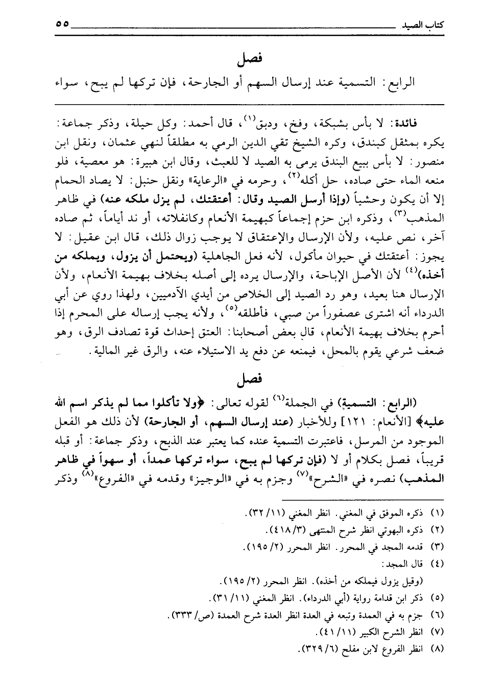 (الرَّابِعُ: التَّسْمِيَةُ) فِي الْجُمْلَةِ، لِقَوْلِهِ تَعَالَى: {وَلا تَأْكُلُوا مِمَّا لَمْ يُذْكَرِ اسْمُ اللَّهِ عَلَيْهِ} [الأنعام: 121] وَلِلْأَخْبَارِ، (عِنْدَ إِرْسَالِ السَّهْمِ أَوِ الْجَارِحَةِ) لِأَنَّ ذَلِكَ هُوَ الْفِعْلُ الْمَوْجُودُ مِنَ الْمُرْسِلِ، فَاعْتُبِرَتِ التَّسْمِيَةُ عِنْدَهُ كَمَا يُعْتَبَرُ عِنْدَ الذَّبْحِ، وَذَكَرَ جَمَاعَةٌ: أَوْ قَبْلَهُ قَرِيبًا، فَصَلَ بِكَلَامٍ أَوْ لَا (فَإِنْ تَرْكَهَا لَمْ يُبَحْ، سَوَاءٌ تَرَكَهَا عَمْدًا أَوْ سَهْوًا فِي ظَاهِرِ الْمَذْهَبِ) نَصَرَهُ فِي الشَّرْحِ، وَجَزَمَ بِهِ فِي الْوَجِيزِ، وَقَدَّمَهُ فِي الْفُرُوعِ، وَذَكَرَ