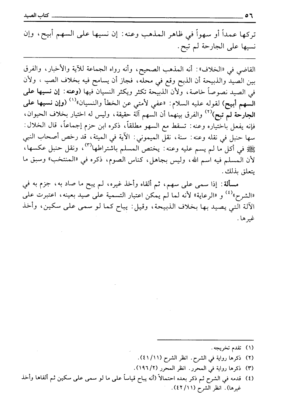 ـــــــــــــــــــــــــــــQالْقَاضِي فِي الْخِلَافِ: أَنَّهُ الْمَذْهَبُ الصَّحِيحُ، وَأَنَّهُ رَوَاهُ الْجَمَاعَةُ، لِلْآيَةِ وَالْأَخْبَارِ، وَالْفَرْقُ بَيْنَ الصَّيْدِ وَالذَّبِيحَةِ أَنَّ الذَّبْحَ وَقَعَ فِي مَحَلِّهِ، فَجَازَ أَنْ يُسَامِحَ فِيهِ، بِخِلَافِ الصَّيْدِ، وَلِأَنَّ فِي الصَّيْدِ نُصُوصًا خَاصَّةً، وَلِأَنَّ الذَّبِيحَةَ تَكْثُرُ وَيَكْثُرُ النِّسْيَانُ فِيهَا، (وَعَنْهُ: إِنْ نَسِيَهَا عَلَى السَّهْمِ أُبِيحَ) لِقَوْلِهِ - عَلَيْهِ السَّلَامُ -: «عُفِيَ لِأُمَّتِي عَنِ الْخَطَأِ وَالنِّسْيَانِ.» (وَإِنْ نَسِيَهَا عَلَى الْجَارِحَةِ لَمْ تُبَحْ) وَالْفَرْقُ بَيْنَهُمَا أَنَّ السَّهْمَ آلَةٌ حَقِيقَةً وَلَيْسَ لَهُ اخْتِيَارٌ، بِخِلَافِ الْحَيَوَانِ، فَإِنَّهُ يَفْعَلُ بِاخْتِيَارِهِ، وَعَنْهُ: تَسْقُطُ مَعَ السَّهْوِ مُطْلَقًا، ذَكَرَهُ ابْنُ حَزْمٍ إِجْمَاعًا، قَالَ الْخَلَّالُ: سَهَا حَنْبَلٌ فِي نَقْلِهِ، وَعَنْهُ: سُنَّةٌ، نَقَلَ الْمَيْمُونِيُّ: الْآيَةُ فِي الْمَيْتَةِ، قَدْ رَخَّصَ أَصْحَابُ النَّبِيِّ - صَلَّى اللَّهُ عَلَيْهِ وَسَلَّمَ - فِي أَكْلِ مَا لَمْ يُسَمَّ عَلَيْهِ، وَعَنْهُ: يَخْتَصُّ الْمُسْلِمُ بِاشْتِرَاطِهَا، وَنَقَلَ حَنْبَلٌ عَكْسَهَا، لِأَنَّ الْمُسْلِمَ فِيهِ اسْمُ اللَّهِ، وَلَيْسَ بِجَاهِلٍ كناس الصوم، ذَكَرَهُ فِي الْمُنْتَخَبِ، وَسَبَقَ مَا يَتَعَلَّقُ بِذَلِكَ.
