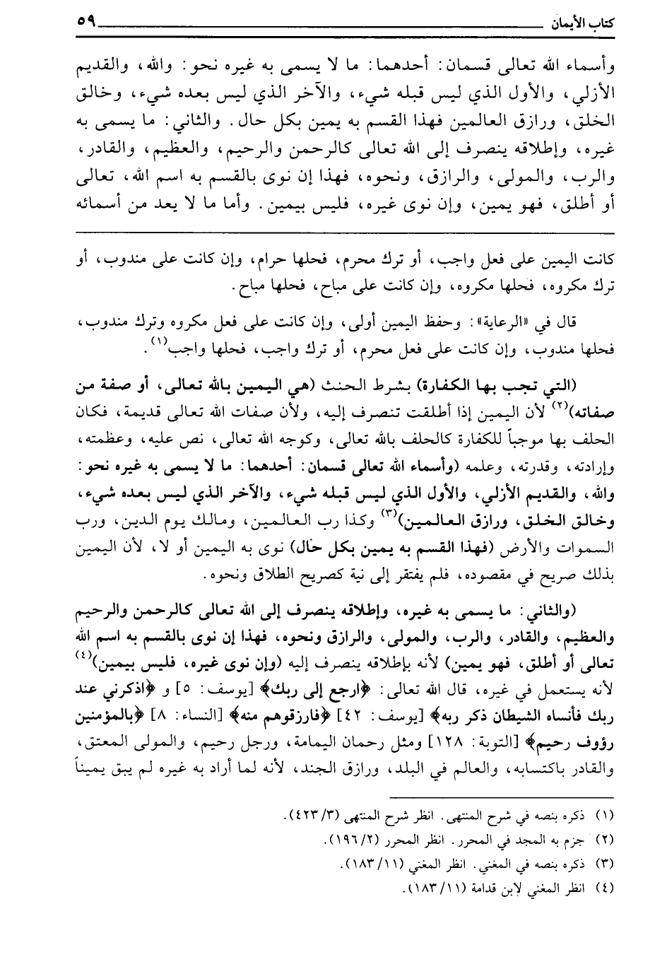 (وَالثَّانِي: مَا يُسَمَّى بِهِ غَيْرُهُ، وَإِطْلَاقُهُ يَنْصَرِفُ إِلَى اللَّهِ تَعَالَى، كَالرَّحْمَنِ، وَالرَّحِيمِ، وَالْعَظِيمِ، وَالْقَادِرِ، وَالرَّبِّ، وَالْمَوْلَى، وَالرَّازِقِ، وَنَحْوِهِ، فَهَذَا إِنْ نَوَى بِالْقَسَمِ بِهِ اسْمَ اللَّهِ تَعَالَى أَوْ أَطْلَقَ، فَهُوَ يَمِينٌ) لِأَنَّهُ بِإِطْلَاقِهِ يَنْصَرِفُ إِلَيْهِ، (وَإِنْ نَوَى غَيْرَهُ فَلَيْسَ بِيَمِينٍ) لِأَنَّهُ يُسْتَعْمَلُ فِي غَيْرِهِ، قَالَ اللَّهُ تَعَالَى: {ارْجِعْ إِلَى رَبِّكَ} [يوسف: 50] وَ {اذْكُرْنِي عِنْدَ رَبِّكَ فَأَنْسَاهُ الشَّيْطَانُ ذِكْرَ رَبِّهِ} [يوسف: 42] ، {فَارْزُقُوهُمْ مِنْهُ} [النساء: 8] {بِالْمُؤْمِنِينَ رَءُوفٌ رَحِيمٌ} [التوبة: 128] ، وَمِثْلَ رَحْمَانِ الْيَمَامَةِ، وَرَجُلٌ رَحِيمٌ، وَالْمَوْلَى الْمُعْتِقُ، وَالْقَادِرُ بِاكْتِسَابِهِ، وَالْعَالِمُ فِي الْبَلَدِ، وَرَازِقُ الْجُنْدِ، لِأَنَّهُ لَمَّا أَرَادَ بِهِ غَيْرَهُ لَمْ يَبْقَ يَمِينًا،
