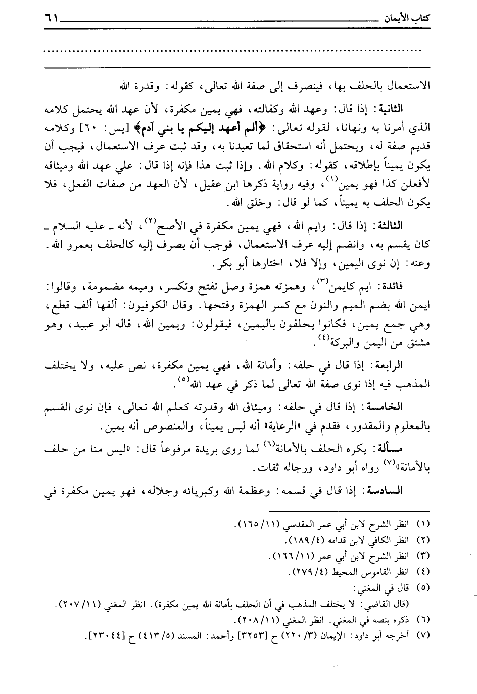 الثَّانِيَةُ: إِذَا قَالَ: وَعَهْدِ اللَّهِ، وَكَفَالَتِهِ، فَهِيَ يَمِينٌ مُكَفَّرَةٌ، لِأَنَّ عَهْدَ اللَّهِ يَحْتَمِلُ كَلَامَهُ الَّذِي أَمَرَنَا بِهِ وَنَهَانَا، لِقَوْلِهِ تَعَالَى: {أَلَمْ أَعْهَدْ إِلَيْكُمْ يَا بَنِي آدَمَ} [يس: 60] وَكَلَامُهُ قَدِيمٌ صِفَةٌ لَهُ، وَيَحْتَمِلُ أَنَّهُ اسْتِحْقَاقٌ لِمَا تَعَبَّدْنَا بِهِ، وَقَدْ ثَبَتَ عُرْفُ الِاسْتِعْمَالِ، فَيَجِبُ أَنْ يَكُونَ يَمِينًا بِإِطْلَاقِهِ، كَقَوْلِهِ: وَكَلَامِ اللَّهِ. وَإِذَا ثَبَتَ هَذَا، فَإِنَّهُ إِذَا قَالَ: عَلَيَّ عَهْدُ اللَّهِ وَمِيثَاقُهُ، لَأَفْعَلَنَّ كَذَا، فَهُوَ يَمِينٌ، وَفِيهِ رِوَايَةٌ ذَكَرَهَا ابْنُ عَقِيلٍ، لِأَنَّ الْعَهْدَ مِنْ صِفَاتِ الْفِعْلِ، فَلَا يَكُونُ الْحَلِفُ بِهِ يَمِينًا، كَمَا لَوْ قَالَ: وَخَلْقِ اللَّهِ.