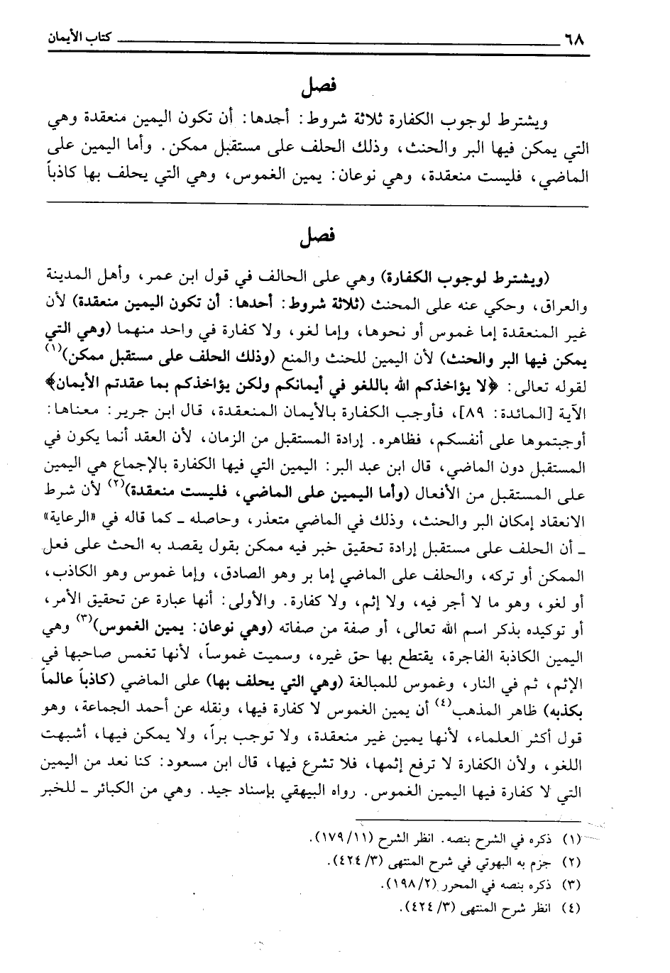 فَصْلٌ (وَيُشْتَرَطُ لِوُجُوبِ الْكَفَّارَةِ) وَهِيَ عَلَى الْحَالِفِ، فِي قَوْلِ ابْنِ عُمَرَ وَأَهْلِ الْمَدِينَةِ وَالْعِرَاقِ، وَحُكِيَ عَنْهُ عَلَى الْمُحْنِثِ، (ثَلَاثَةُ شُرُوطٍ: أَحَدُهَا: أَنْ تَكُونَ الْيَمِينُ مُنْعَقِدَةً) لأن غير الْمُنْعَقِدَة: إِمَّا غَمُوسٌ، أَوْ نَحْوُهَا، وَإِمَّا لَغْوٌ، وَلَا كَفَّارَةَ فِي وَاحِدٍ مِنْهُمَا، (وَهِيَ الَّتِي يُمْكِنُ فِيهَا الْبِرُّ وَالْحِنْثُ) لِأَنَّ الْيَمِينَ لِلْحِنْثِ وَالْمَنْعِ، (وَذَلِكَ الْحَلِفُ عَلَى مُسْتَقْبَلٍ مُمْكِنٍ) لِقَوْلِهِ تَعَالَى: {لا يُؤَاخِذُكُمُ اللَّهُ بِاللَّغْوِ فِي أَيْمَانِكُمْ وَلَكِنْ يُؤَاخِذُكُمْ بِمَا عَقَّدْتُمُ الأَيْمَانَ} [المائدة: 89] الْآيَةَ، فَأَوْجَبَ الْكَفَّارَةَ بِالْأَيْمَانِ الْمُنْعَقِدَةِ، قَالَ ابْنُ جَرِيرٍ: مَعْنَاهَا أَوْجَبْتُمُوهَا عَلَى أَنْفُسِكُمْ، فَظَاهِرُهُ إِرَادَةُ الْمُسْتَقْبَلِ مِنَ الزَّمَانِ، لِأَنَّ الْعَقْدَ إِنَّمَا يَكُونُ فِي الْمُسْتَقْبَلِ دُونَ الْمَاضِي، قَالَ ابْنُ عَبْدِ الْبَرِّ: الْيَمِينُ الَّتِي فِيهَا الْكَفَّارَةُ بِالْإِجْمَاعِ هِيَ الْيَمِينُ عَلَى الْمُسْتَقْبَلِ مِنَ الْأَفْعَالِ. (وَأَمَّا الْيَمِينُ عَلَى الْمَاضِي فَلَيْسَتْ مُنْعَقِدَةً) لِأَنَّ شَرْطَ الِانْعِقَادِ إِمْكَانُ الْبِرِّ وَالْحِنْثِ، وَذَلِكَ فِي الْمَاضِي مُتَعَذِّرٌ، وَحَاصِلُهُ ـ كَمَا قَالَهُ فِي الرِّعَايَةِ ـ أَنَّ الْحَلِفَ عَلَى مُسْتَقْبَلٍ إِرَادَةَ تَحْقِيقِ خَبَرٍ فِيهِ مُمْكِنٌ بِقَوْلٍ يُقْصَدُ بِهِ الْحَثُّ عَلَى فِعْلِ الْمُمْكِنِ أَوْ تَرْكِهِ، وَالْحَلِفُ عَلَى الْمَاضِي إِمَّا بِرٌّ، وَهُوَ الصَّادِقُ، وَإِمَّا غَمُوسٌ، وَهُوَ الْكَاذِبُ، أَوْ لَغْوٌ وَهُوَ مَا لَا أَجْرَ فِيهِ وَلَا إِثْمَ وَلَا كَفَّارَةَ، وَالْأَوْلَى أَنَّهَا عِبَارَةُ الْأَمْرِ أَوْ تَوْكِيدُهُ بِذِكْرِ اسْمِ اللَّهِ تَعَالَى أَوْ صِفَةٍ مِنْ صِفَاتِهِ، (وَهِيَ نَوْعَانِ: يَمِينُ الْغَمُوسِ) وَهِيَ الْيَمِينُ الْكَاذِبَةُ الْفَاجِرَةُ، يَقْتَطِعُ بِهَا حَقَّ غَيْرِهِ، وَسُمِّيَتْ غَمُوسًا لِأَنَّهَا تَغْمِسُ صَاحِبَهَا فِي الْإِثْمِ ثُمَّ فِي النَّارِ، وَغَمُوسٌ لِلْمُبَالَغَةِ، (وَهِيَ الَّتِي يَحْلِفُ بِهَا) عَلَى الْمَاضِي، (كَاذِبًا عَالِمًا بِكَذِبِهِ) ظَاهِرُ الْمَذْهَبِ أَنَّ يَمِينَ الْغَمُوسِ لَا كَفَّارَةَ فِيهَا، وَنَقَلَهُ عَنْ أَحْمَدَ الْجَمَاعَةُ، وَهُوَ قَوْلُ أَكْثَرِ الْعُلَمَاءِ، لِأَنَّهَا يمين غير مُنْعَقِدَة، وَلَا تُوجِبُ بَرًّا، وَلَا يُمْكِنُ فِيهَا، أَشْبَهَتِ اللَّغْوَ، وَلِأَنَّ الْكَفَّارَةَ لَا تَرْفَعُ إِثْمَهَا، فَلَا تُشْرَعُ فِيهَا، قَالَ ابْنُ مَسْعُودٍ: كُنَّا نَعُدُّ مِنَ الْيَمِينِ الَّتِي لَا كَفَّارَةَ فِيهَا الْيَمِينَ الْغَمُوسَ، رَوَاهُ الْبَيْهَقِيُّ بِإِسْنَادٍ جَيِّدٍ، وَهِيَ مِنَ الْكَبَائِرِ ـ لِلْخَبَرِ