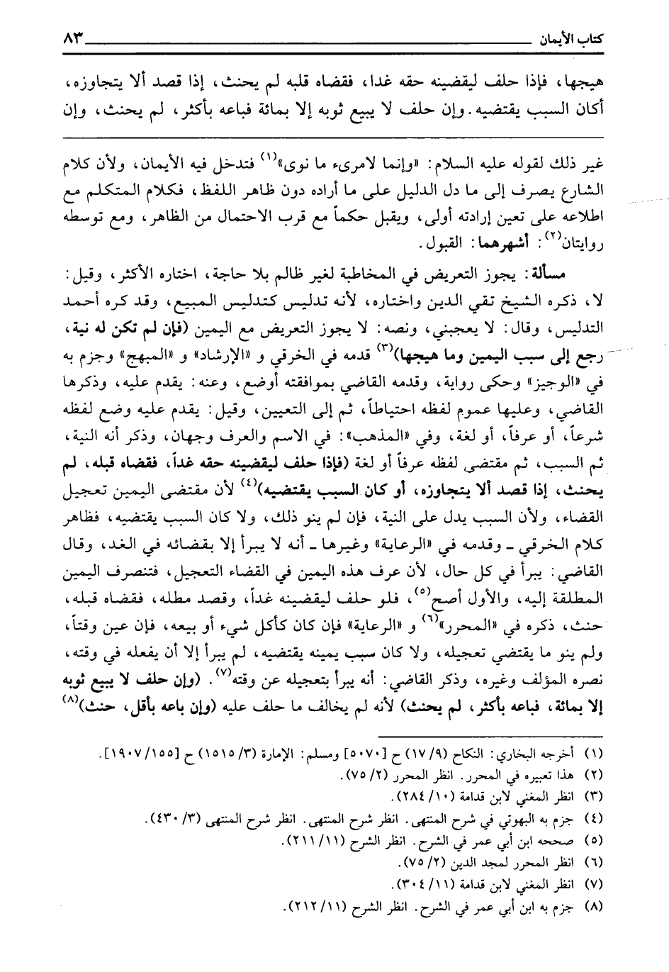 مَسْأَلَةٌ: يَجُوزُ التَّعْرِيضُ فِي الْمُخَاطَبَةِ لِغَيْرِ ظَالِمٍ بِلَا حَاجَةٍ، اخْتَارَهُ الْأَكْثَرُ، وَقِيلَ: لَا، ذَكَرَهُ الشَّيْخُ تَقِيُّ الدِّينِ، وَاخْتَارَهُ، لِأَنَّهُ تَدْلِيسٌ كَتَدْلِيسِ الْمَبِيعِ، وَقَدْ كَرِهَ أَحْمَدُ التَّدْلِيسَ، وَقَالَ: لَا يُعْجِبُنِي، وَنَصُّهُ: لَا يَجُوزُ التَّعْرِيضُ مَعَ الْيَمِينِ، (فَإِنْ لَمْ تَكُنْ لَهُ نِيَّةٌ رُجِعَ إِلَى سَبَبِ الْيَمِينِ وَمَا هَيَّجَهَا) قَدَّمَهُ فِي الْخِرَقِيِّ وَالْإِرْشَادِ وَالْمُبْهِجِ، وَجَزَمَ بِهِ فِي الْوَجِيزِ، وَحَكَى رِوَايَةً، وَقَدَّمَهُ الْقَاضِي بِمُوَافَقَتِهِ أوضع، وَعَنْهُ: يُقَدَّمُ عَلَيْهِ، وَذَكَرَهَا الْقَاضِي، وَعَلَيْهَا عُمُومُ لَفْظِهِ احْتِيَاطًا، ثُمَّ إِلَى التَّعْيِينِ، وَقِيلَ: يُقَدَّمُ عَلَيْهِ وَضْعُ لَفْظِهِ شَرْعًا أَوْ عُرْفًا أَوْ لُغَةً، وَفِي الْمَذْهَبِ: فِي الِاسْمِ وَالْعُرْفِ وَجْهَانِ، وَذَكَرَ أَنَّهُ النِّيَّةُ، ثُمَّ السَّبَبُ، ثُمَّ مُقْتَضَى لَفْظِهِ عُرْفًا أَوْ لُغَةً، (فَإِذَا حَلَفَ: لَيَقْضِيَنَّهُ حَقَّهُ غَدًا، فَقَضَاهُ قَبْلَهُ، لَمْ يَحْنَثْ إِذَا قَصَدَ أَلَّا يَتَجَاوَزَهُ، أَوْ كَانَ السَّبَبُ يَقْتَضِيهِ) لِأَنَّ مُقْتَضَى الْيَمِينِ تَعْجِيلُ الْقَضَاءِ، وَلِأَنَّ السَّبَبَ يَدُلُّ عَلَى النِّيَّةِ، فَإِنْ لَمْ يَنْوِ ذَلِكَ، وَلَا كَانَ السَّبَبُ يَقْتَضِيهِ، فَظَاهِرُ كَلَامِ الْخِرَقِيِّ ـ وَقَدَّمَهُ فِي الرِّعَايَةِ وَغَيْرِهَا ـ أَنَّهُ لَا يَبْرَأُ إِلَّا بِقَضَائِهِ فِي الْغَدِ، وَقَالَ الْقَاضِي: يَبْرَأُ فِي كُلِّ حَالٍ، لِأَنَّ عُرْفَ هَذِهِ الْيَمِينِ فِي الْقَضَاءِ التَّعْجِيلُ، فَتَنْصَرِفُ الْيَمِينُ الْمُطْلَقَةُ إِلَيْهِ، وَالْأَوَّلُ أَصَحُّ، فَلَوْ حَلَفَ لَيَقْضِيَنَّهُ غَدًا، وَقَصَدَ مَطْلَهُ، فَقَضَاهُ قَبْلَهُ، حَنِثَ، ذَكَرَهُ فِي الْمُحَرَّرِ وَالرِّعَايَةِ، فَإِنْ كَانَ كَأَكْلِ شَيْءٍ أَوْ بَيْعِهِ، فَإِنْ عَيَّنَ وَقْتًا، وَلَمْ يَنْوِ مَا يَقْتَضِي تَعْجِيلَهُ، وَلَا كَانَ سَبَبُ يَمِينِهِ يَقْتَضِيهِ، لَمْ يَبْرَأْ إِلَّا أَنْ يَفْعَلَهُ فِي وَقْتِهِ، نَصَرَهُ الْمُؤَلِّفُ وَغَيْرُهُ، وَذَكَرَ الْقَاضِي: أَنَّهُ يَبْرَأُ بِتَعْجِيلِهِ عَنْ وَقْتِهِ، (وَإِنْ حَلَفَ لَا يَبِيعُ ثَوْبَهُ إِلَّا بِمِائَةٍ، فَبَاعَهُ، بِأَكْثَرَ لَمْ يَحْنَثْ) لِأَنَّهُ لَمْ يُخَالِفْ مَا حَلَفَ عَلَيْهِ، (وَإِنْ بَاعَهُ بِأَقَلَّ حَنِثَ)