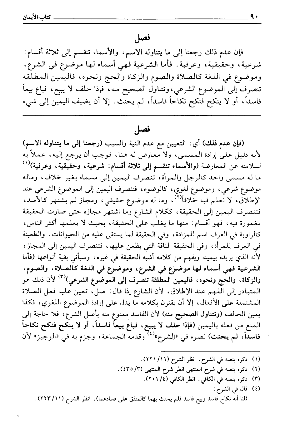فَصْلٌ فَإِنْ عُدِمَ ذَلِكَ رَجَعْنَا إِلَى مَا يَتَنَاوَلُهُ الِاسْمُ، وَالْأَسْمَاءُ تَنْقَسِمُ إِلَى ثَلَاثَةِ أَقْسَامٍ: شَرْعِيَّةٍ، وَحَقِيقِيَّةٍ، وَعُرْفِيَّةٍ. فَأَمَّا الشَّرْعِيَّةُ، فَهِيَ: أَسْمَاءٌ لَهَا مَوْضُوعٌ فِي الشَّرْعِ، وَمَوْضُوعٌ فِي اللُّغَةِ، كَالصَّلَاةِ وَالصَّوْمِ وَالزَّكَاةِ وَالْحَجِّ وَنَحْوِهِ، فَالْيَمِينُ الْمُطْلَقَةُ تَنْصَرِفُ إِلَى الْمَوْضُوعِ الشَّرْعِيِّ، وَتَتَنَاوَلُ الصَّحِيحَ مِنْهُ، فَإِذَا حَلَفَ لَا يَبِيعُ، فَبَاعَ بَيْعًا فَاسِدًا، أَوْ لَا يَنْكِحُ، فَنَكَحَ نِكَاحًا فَاسِدًا، لَمْ يَحْنَثْ. إِلَّا أَنْ يُضِيفَ الْيَمِينَ إِلَى شَيْءٍ