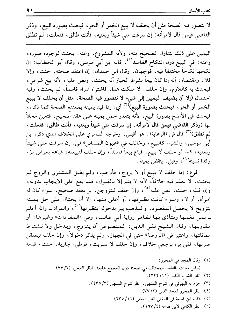 ـــــــــــــــــــــــــــــQالْيَمِينَ عَلَى ذَلِكَ تَتَنَاوَلُ الصَّحِيحَ مِنْهُ، وَلِأَنَّهُ الْمَشْرُوعُ، وَعَنْهُ: يَحْنَثُ، لِوُجُودِهِ صُورَةً، وَعَنْهُ: فِي الْبَيْعِ دُونَ النِّكَاحِ الْفَاسِدِ، قَالَهُ ابْنُ أَبِي مُوسَى، وَقَالَ أَبُو الْخَطَّابِ: إِنْ نَكَحَهَا نِكَاحًا مُخْتَلَفًا فِيهِ، فَوَجْهَانِ، وَقَالَ ابْنُ حَمْدَانَ: إِنِ اعْتَقَدَ صِحَّتَهُ حَنِثَ، وَإِلَّا فَلَا، وَمُقْتَضَاهُ: أَنَّهُ إِذَا كَانَ بَيْعًا بِشَرْطِ الْخِيَارِ أَنَّهُ يَحْنَثُ وَنَصَّ عَلَيْهِ، لِأَنَّهُ بَيْعٌ شَرْعِيٌّ، فَيَحْنَثُ بِهِ كَاللَّازِمِ، وَإِنْ حَلَفَ: لَا مَلَكْتُ هَذَا، فَاشْتَرَاهُ شِرَاءً فَاسِدًا، لَمْ يَحْنَثْ، وَفِيهِ احْتِمَالٌ، (إِلَّا أَنْ يُضِيفَ الْيَمِينُ إِلَى شَيْءٍ لَا تُتَصَوَّرُ فِيهِ الصِّحَّةُ، مِثْلَ أَنْ يَحْلِفَ لَا يَبِيعُ الْخَمْرَ، أَوِ الْحُرَّ، فَيَحْنَثَ بِصُورَةِ الْبَيْعِ) أَيْ: إِذَا قَيَّدَ يَمِينَهُ بِمُمْتَنِعِ الصِّحَّةِ كَمَا ذَكَرَهُ، فَيَحْنَثُ فِي الْأَصَحِّ، بِصُورَةِ الْبَيْعِ، لِأَنَّهُ يَتَعَذَّرُ حَمْلُ يَمِينِهِ عَلَى عَقْدٍ صَحِيحٍ، فَتَعَيَّنَ مَحَلًّا لَهَا، (وَذَكَرَ الْقَاضِي فِيمَنْ قَالَ لِامْرَأَتِهِ: إِنْ سَرَقْتِ مِنِّي شَيْئًا وَبِعْتِيهِ، فَأَنْتِ طَالِقٌ، فَفَعَلَتْ، لَمْ تُطَلَّقْ) قَالَ فِي الرِّعَايَةِ: هُوَ أَقْيَسُ، وَخَرَّجَهُ السَّامِرِيُّ عَلَى الْخِلَافِ الَّذِي ذَكَرَهُ ابْنُ أَبِي مُوسَى، وَالشِّرَاءُ كَالْبَيْعِ، وَخَالَفَ فِي عُيُونِ الْمَسَائِلِ فِي: إِنْ سَرَقْتِ مِنِّي شَيْئًا وَبِعْتِيهِ، كَمَا لَوْ حَلَفَ لَا يَبِيعُ، فَبَاعَ بَيْعًا فَاسِدًا، وَإِنْ حَلَفَ لَتَبِيعَنَّهُ، فَبَاعَهُ بِعَرْضٍ بَرَّ، وَكَذَا نَسِيئَةً، وَقِيلَ: يُنْقَضُ يَمِينُهُ.