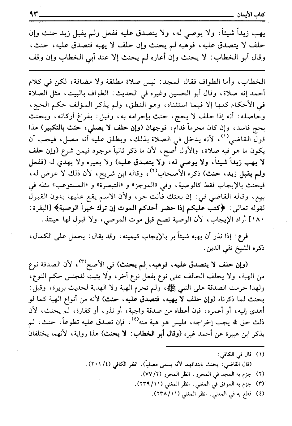 ـــــــــــــــــــــــــــــQالْخَطَّابِ، وَأَمَّا الطَّوَافُ فَقَالَ الْمَجْدُ: لَيْسَ صَلَاةً مُطْلَقَةً وَلَا مُضَافَةً، لَكِنْ فِي كَلَامِ أَحْمَدَ إِنَّهُ صَلَاةٌ، وَقَالَ أَبُو الْحُسَيْنِ وَغَيْرُهُ فِي الْحَدِيثِ: الطَّوَافُ بِالْبَيْتِ مِثْلَ الصَّلَاةِ فِي الْأَحْكَامِ كُلِّهَا، إِلَّا فِيمَا اسْتَثْنَاهُ، وَهُوَ النُّطْقُ، وَلَمْ يَذْكُرِ الْمُؤَلِّفُ حُكْمَ الْحَجِّ، وَحَاصِلُهُ أَنَّهُ إِذَا حَلَفَ لَا يَحُجُّ حَنِثَ بِإِحْرَامِهِ بِهِ، وَقِيلَ: بِفَرَاغِ أَرْكَانِهِ، وَيَحْنَثُ بِحَجٍّ فَاسِدٍ، وَإِنْ كَانَ مُحْرِمًا فَدَامَ فَوَجْهَانِ (وَإِنْ حَلَفَ لَا يُصَلِّي حَنِثَ بِالتَّكْبِيرِ) هَذَا قَوْلُ الْقَاضِي، لِأَنَّهُ يَدْخُلُ فِي الصَّلَاةِ بِذَلِكَ، وَيُطْلَقُ عَلَيْهِ أَنَّهُ مُصَلٍّ، فَيَجِبُ أَنْ يَكُونَ مَا هُوَ فِيهِ صَلَاةً، وَالْأَوَّلُ أَصَحُّ، لِأَنَّ مَا ذُكِرَ ثَانِيًا مَوْجُودٌ فِيمَنْ شَرَعَ (وَإِنْ حَلَفَ لَا يَهَبُ زَيْدًا شَيْئًا، وَلَا يُوصِي لَهُ، وَلَا يَتَصَدَّقُ عَلَيْهِ) وَلَا يُعِيرُهُ، وَلَا يُهْدِي لَهُ (فَفَعَلَ وَلَمْ يَقْبَلْ زَيْدٌ، حَنِثَ) ذَكَرَهُ الْأَصْحَابُ، وَقَالَهُ ابْنُ شُرَيْحٍ: لِأَنَّ ذَلِكَ لَا عِوَضَ لَهُ، فَيَحْنَثُ بِالْإِيجَابِ فَقَطْ، كَالْوَصِيَّةِ، وَفِي الْمُوجَزِ وَالتَّبْصِرَةِ وَالْمُسْتَوْعِبِ مِثْلُهُ فِي بَيْعٍ، وَقَالَهُ الْقَاضِي فِي: إِنْ بِعْتُكَ فَأَنْتَ حُرٌّ، وَلِأَنَّ الِاسْمَ يَقَعُ عَلَيْهَا بِدُونِ الْقَبُولِ، لِقَوْلِهِ تَعَالَى: {كُتِبَ عَلَيْكُمْ إِذَا حَضَرَ أَحَدَكُمُ الْمَوْتُ إِنْ تَرَكَ خَيْرًا الْوَصِيَّةُ} [البقرة: 180] ، أَرَادَ الْإِيجَابَ، لِأَنَّ الْوَصِيَّةَ تَصِحُّ قَبْلَ مَوْتِ الْمُوصِي، وَلَا قَبُولَ لَهَا حِينَئِذٍ.
