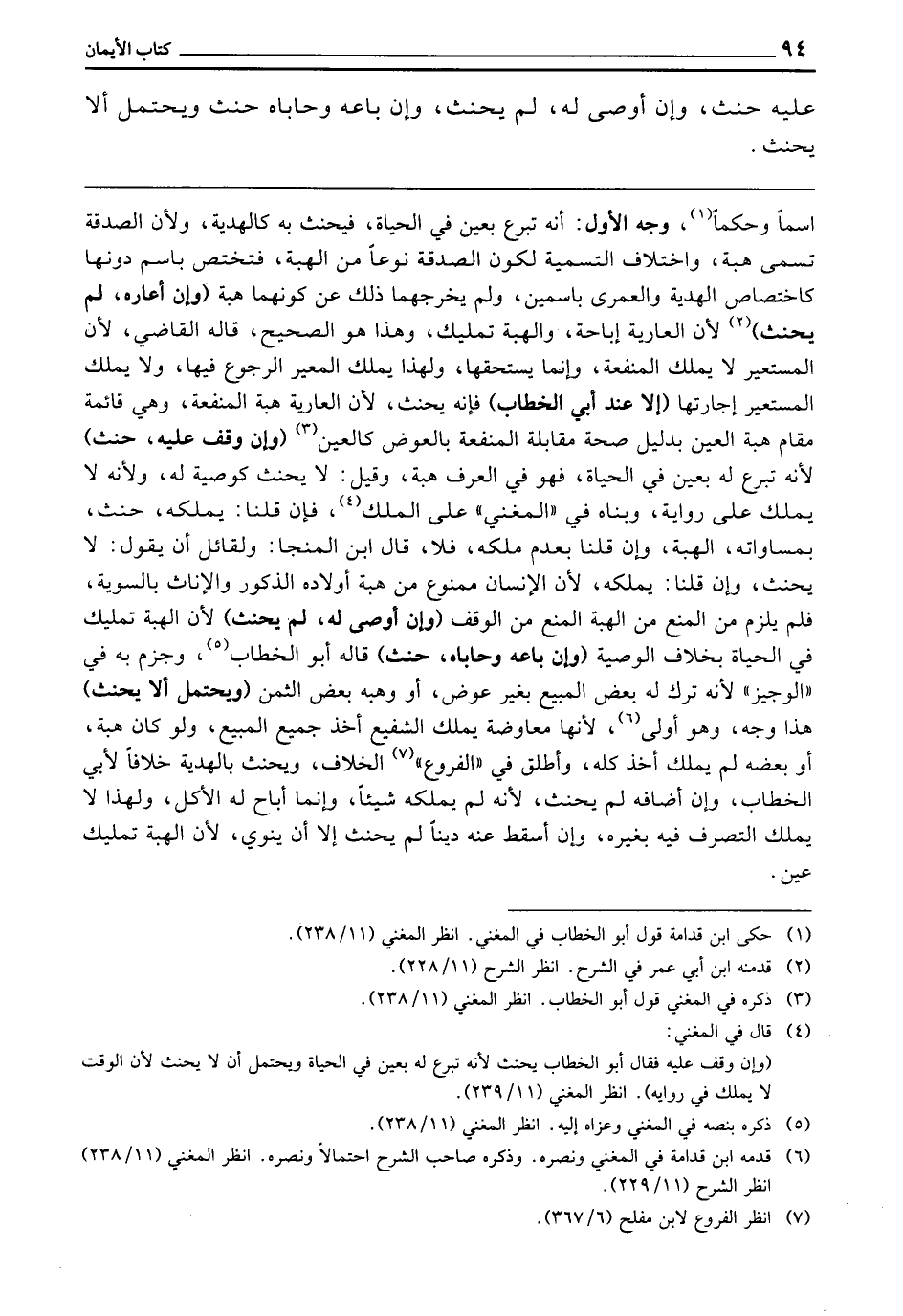 ـــــــــــــــــــــــــــــQاسْمًا وَحُكْمًا، وَجْهُ الْأَوَّلِ: أَنَّهُ تَبَرَّعَ بِعَيْنٍ فِي الْحَيَاةِ فَيَحْنَثُ بِهِ كَالْهَدِيَّةِ، وَلِأَنَّ الصَّدَقَةَ تُسَمَّى هِبَةً، وَاخْتِلَافُ التَّسْمِيَةِ لِكَوْنِ الصَّدَقَةِ نَوْعًا مِنَ الْهِبَةِ، فَتَخْتَصُّ بِاسْمٍ دُونَهَا، كَاخْتِصَاصِ الْهَدِيَّةِ وَالْعُمْرَى بِاسْمَيْنِ، وَلَمْ يُخْرِجْهُمَا ذَلِكَ عَنْ كَوْنِهِمَا هِبَةً (وَإِنْ أَعَارَهُ لَمْ يَحْنَثْ) لِأَنَّ الْعَارِيَةَ إِبَاحَةٌ، وَالْهِبَةَ تَمْلِيكٌ، وَهَذَا هُوَ الصَّحِيحُ، قَالَهُ الْقَاضِي، لِأَنَّ الْمُسْتَعِيرَ لَا يَمْلِكُ الْمَنْفَعَةَ، وَإِنَّمَا يَسْتَحِقُّهَا، وَلِهَذَا يَمْلِكُ الْمُعِيرُ الرُّجُوعَ فِيهَا، وَلَا يَمْلِكُ الْمُسْتَعِيرُ إِجَارَتَهَا (إِلَّا عِنْدَ أَبِي الْخَطَّابِ) فَإِنَّهُ يَحْنَثُ، لِأَنَّ الْعَارِيَةَ هِبَةُ الْمَنْفَعَةِ، وَهِيَ قَائِمَةٌ مَقَامَ هِبَةِ الْعَيْنِ، بِدَلِيلِ صِحَّةِ مُقَابَلَةِ الْمَنْفَعَةِ بِالْعِوَضِ كَالْعَيْنِ (وَإِنْ وَقَفَ عَلَيْهِ حَنِثَ) لِأَنَّهُ تَبَرُّعٌ لَهُ بِعَيْنٍ فِي الْحَيَاةِ، فَهُوَ فِي الْعُرْفِ هِبَةٌ، وَقِيلَ: لَا يَحْنَثُ، كَوَصِيَّةٍ لَهُ، وَلِأَنَّهُ لَا يُمْلَكُ عَلَى رِوَايَةٍ، وَبَنَاهُ فِي الْمُغْنِي عَلَى الْمِلْكِ، فَإِنْ قُلْنَا: يَمْلِكُهُ حَنِثَ بِمُسَاوَاتِهِ الْهِبَةَ، وَإِنْ قُلْنَا بِعَدَمِ مِلْكِهِ فَلَا، قَالَ ابْنُ الْمُنَجَّا: وَلِقَائِلٍ أَنْ يَقُولَ: لَا يَحْنَثُ، وَإِنْ قُلْنَا: يَمْلِكُهُ، لِأَنَّ الْإِنْسَانَ مَمْنُوعٌ مِنْ هِبَةِ أَوْلَادِهِ الذُّكُورِ وَالْإِنَاثِ بِالسَّوِيَّةِ، فَلَمْ يَلْزَمْ مِنَ الْمَنْعِ مِنَ الْهِبَةِ الْمَنْعُ مِنَ الْوَقْفِ (وَإِنْ أَوْصَى لَهُ لَمْ يَحْنَثْ) لِأَنَّ الْهِبَةَ تَمْلِيكٌ فِي الْحَيَاةِ، بِخِلَافِ الْوَصِيَّةِ (وَإِنْ بَاعَهُ وَحَابَاهُ حَنِثَ) قَالَهُ أَبُو الْخَطَّابِ، وَجَزَمَ بِهِ فِي الْوَجِيزِ، لِأَنَّهُ تَرَكَ لَهُ بَعْضَ الْمَبِيعِ بِغَيْرِ عِوَضٍ، أَوْ وَهَبَهُ بَعْضَ الثَّمَنِ (وَيُحْتَمَلُ أَلَّا يَحْنَثَ) هَذَا وَجْهٌ، وَهُوَ أَوْلَى، لِأَنَّهَا مُعَاوَضَةٌ يَمْلِكُ الشَّفِيعُ أَخَذَ جَمِيعِ الْمَبِيعِ، وَلَوْ كَانَ هِبَةً أَوْ بَعْضَهُ لَمْ يَمْلِكْ أَخْذَ كُلِّهِ، وَأَطْلَقَ فِي الْفُرُوعِ الْخِلَافَ، وَيَحْنَثُ بِالْهَدِيَّةِ خِلَافًا لِأَبِي الْخَطَّابِ، وَإِنْ أَضَافَهُ لَمْ يَحْنَثْ، لِأَنَّهُ لَمْ يُمَلِّكْهُ شَيْئًا، وَإِنَّمَا أَبَاحَ لَهُ الْأَكْلَ، وَلِهَذَا لَا يَمْلِكُ التَّصَرُّفَ فِيهِ بِغَيْرِهِ، وَإِنْ أَسْقَطَ عَنْهُ دَيْنًا لَمْ يَحْنَثْ، إِلَّا أَنْ يَنْوِيَ، لِأَنَّ الْهِبَةَ تَمْلِيكُ عَيْنٍ.