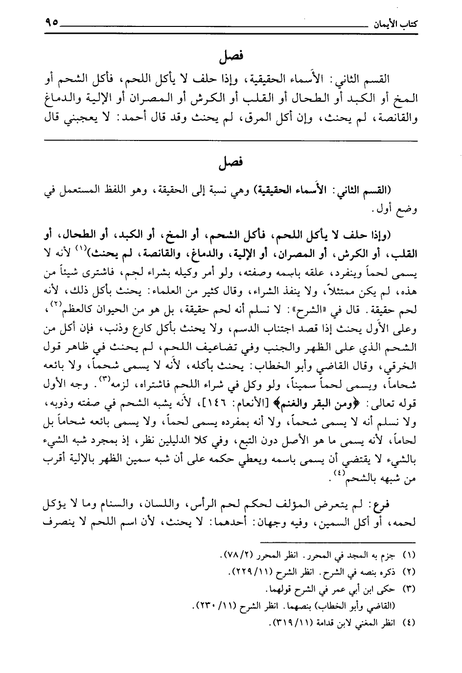 فَصْلٌ الْقِسْمُ الثَّانِي: الْأَسْمَاءُ الْحَقِيقِيَّةُ، وإِذَا حَلَفَ لَا يَأْكُلُ اللَّحْمَ، فَأَكَلَ الشَّحْمَ، أَوِ الْمُخَّ، أَوِ الْكَبِدَ، أَوِ الطِّحَالَ، أَوِ الْقَلْبَ، أَوِ الْكِرْشَ، أَوِ الْمُصْرَانَ، أَوِ الْإِلْيَةَ وَالدِّمَاغَ وَالْقَانِصَةَ، لَمْ يَحْنَثْ. وَإِنْ أَكَلَ الْمَرَقَ لَمْ يَحْنَثْ، وَقَدْ قَالَ أَحْمَدُ: لَا يُعْجِبُنِي، قَالَ