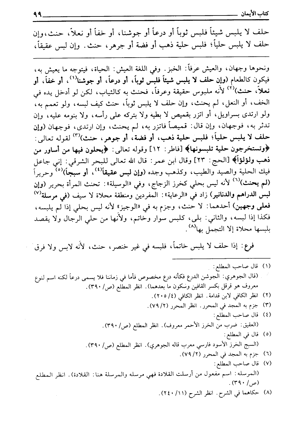 (وَإِنْ حَلَفَ لَا يَلْبَسُ شَيْئًا فَلَبِسَ ثَوْبًا أَوْ دِرْعًا، أَوْ جَوْشَنًا، أَوْ خُفًّا، أَوْ نَعْلًا حَنِثَ) لِأَنَّهُ مَلْبُوسٌ حَقِيقَةً وَعُرْفًا، فَحَنِثَ بِهِ كَالثِّيَابِ، لَكِنْ لَوْ أَدْخَلَ يَدَهُ فِي الْخُفِّ أَوِ النَّعْلِ لَمْ يَحْنَثْ، وَإِنْ حَلَفَ لَا يَلْبَسُ ثَوْبًا حَنِثَ كَيْفَ لَبِسَهُ، وَلَوْ تَعَمَّمَ بِهِ، وَلَوِ ارْتَدَى بِسَرَاوِيلَ، أَوِ اتَّزَرَ بِقَمِيصٍ لا بطيه، وَلَا بِتَرْكِهِ عَلَى رَأْسِهِ، وَلَا بِنَوْمِهِ عَلَيْهِ، وَإِنْ تَدَثَّرَ بِهِ فَوَجْهَانِ، وَإِنْ قَالَ: قَمِيصًا، فَاتَّزَرَ بِهِ، لَمْ يَحْنَثْ، وَإِنِ ارْتَدَى فَوَجْهَانِ (وَإِنْ حَلَفَ لَا يَلْبَسُ حُلِيًّا، فَلَبِسَ حِلْيَةَ ذَهَبٍ أَوْ فِضَّةٍ أَوْ جَوْهَرٍ، حَنِثَ) لِقَوْلِهِ تَعَالَى: {وَتَسْتَخْرِجُونَ حِلْيَةً تَلْبَسُونَهَا} [فاطر: 12] ، وقَوْله تَعَالَى: {يُحَلَّوْنَ فِيهَا مِنْ أَسَاوِرَ مِنْ ذَهَبٍ وَلُؤْلُؤًا} [الحج: 23] ، وَقَالَ ابْنُ عُمَرَ: قَالَ اللَّهُ تَعَالَى لِلْبَحْرِ الشَّرْقِيِّ: إِنِّي جَاعِلٌ فِيكَ الْحِلْيَةَ، وَالصَّيْدَ، وَالطِّيبَ، وَكَذَهَبٍ وَجَدَهُ، (وَإِنْ لَبِسَ عَقِيقًا أَوْ سَبَجًا) وَحَرِيرًا (لَمْ يَحْنَثْ) لِأَنَّهُ لَيْسَ بِحُلِيٍّ كَخَرَزِ الزُّجَاجِ، وَفِي الْوَسِيلَةِ: تَحْنَثُ الْمَرْأَةُ بِحَرِيرٍ، (وَإِنْ لَبِسَ الدَّرَاهِمَ وَالدَّنَانِيرَ) زَادَ فِي الرِّعَايَةِ: الْمُفْرَدِينَ، وَمِنْطَقَةٌ مُحَلَّاةٌ لَا سَيْفٌ، (فِي مُرْسَلَةٍ فَعَلَى وَجْهَيْنِ) أَحَدُهُمَا: لَا حِنْثَ، وَجَزَمَ بِهِ فِي الْوَجِيزِ، لِأَنَّهُ لَيْسَ بِحُلِيٍّ إِذَا لَمْ يَلْبَسْهُ، فَكَذَا إِذَا لَبِسَهُ، وَالثَّانِي: بَلَى، كَلَبْسِ سُوَارٍ وَخَاتَمٍ، وَلِأَنَّهَا مِنْ حُلِيِّ الرِّجَالِ، وَلَا يُقْصَدُ بِلَبْسِهَا مُحَلَّاةً إِلَّا التَّجَمُّلُ بِهَا.