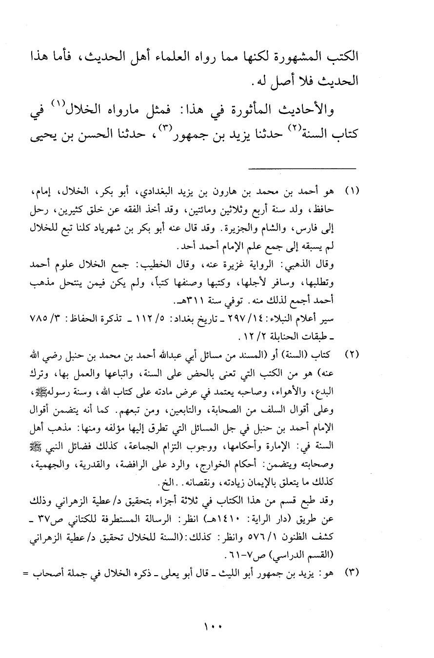 الكتب المشهورة لكنها مما رواه العلماء أهل الحديث فأما هذا الحديث فلا أصل له والأحاديث المأثورة في هذا فمثل ما رواه الخلال في كتاب السنة حدثنا يزيد بن جمهور حدثنا الحسن بن يحيى