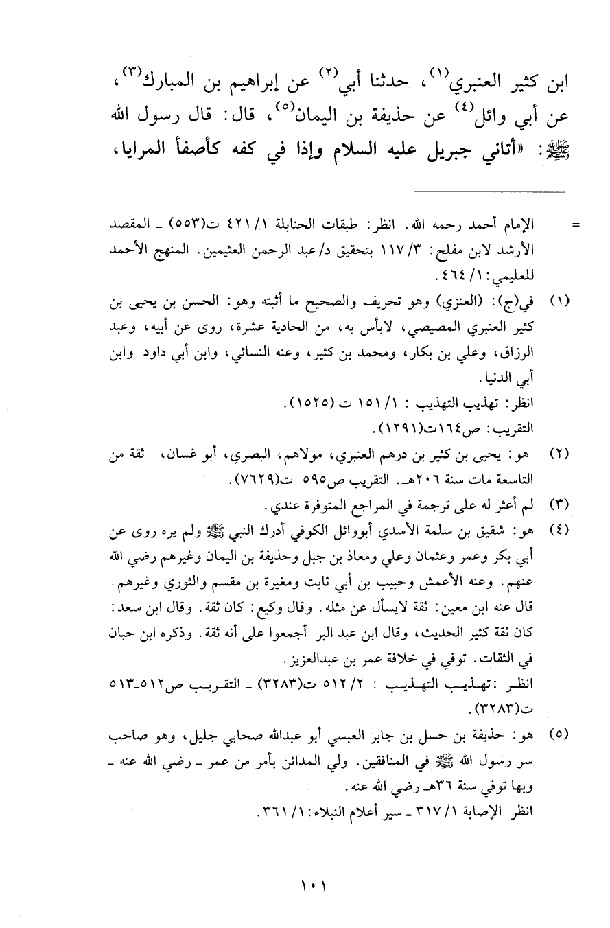 ابن كثير العنبري حدثنا أبي عن إبراهيم بن المبارك عن أبي وائل عن حذيفة بن اليمان قال قال رسول الله صلى الله عليه وسلم أتاني جبريل عليه السلام وإذا في كفه كأصفأ المرايا