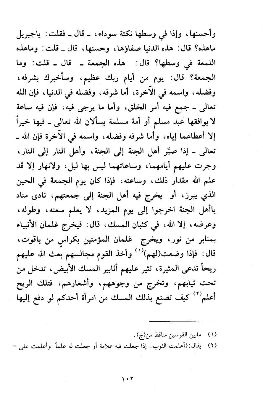 وأحسنها وإذا في وسطها نكتة سوداء قال فقلت يا جبريل ما هذه قال هذه الدنيا صفاؤها وحسنها قال قلت وما هذه اللمعة في وسطها قال هذه الجمعة قال قلت وما الجمعة قال يوم من أيام ربك عظيم وسأخبرك بشرفه وفضله واسمه في الآخرة أما شرفه وفضله في الدنيا فإن الله تعالى جمع فيه أمر الخلق وأما ما يرجى فيه فإن فيه ساعة لا يوافقها عبد مسلم أو أمة مسلمة يسألان الله تعالى فيها خيراً إلا أعطاهما إياه وأما شرفه وفضله واسمه في الآخرة فإن الله تعالى إذا صيَّر أهل الجنة إلى الجنة وأهل النار إلى النار وجرت عليهم أيامهما وساعاتهما ليس بها ليل ولا نهار إلا قد علم الله مقدار ذلك وساعته فإذا كان يوم الجمعة في الحين الذي يبرز أو يخرج فيه أهل الجنة إلى جمعتهم نادى مناد يا أهل الجنة اخرجوا إلى يوم المزيد لا يعلم سعته وطوله وعرضه إلا الله في كثبان المسك قال فيخرج غلمان الأنبياء بمنابر من نور ويخرج غلمان المؤمنين بكراسٍ من ياقوت قال فإذا وضعت لهم وأخذ القوم مجالسهم بعث الله عليهم ريحاً تدعى المثيرة تثير عليهم أثابير المسك الأبيض تدخل من تحت ثيابهم وتخرج من وجوههم وأشعارهم فتلك الريح أعلم كيف تصنع بذلك المسك من امرأة أحدكم لو دفع إليها