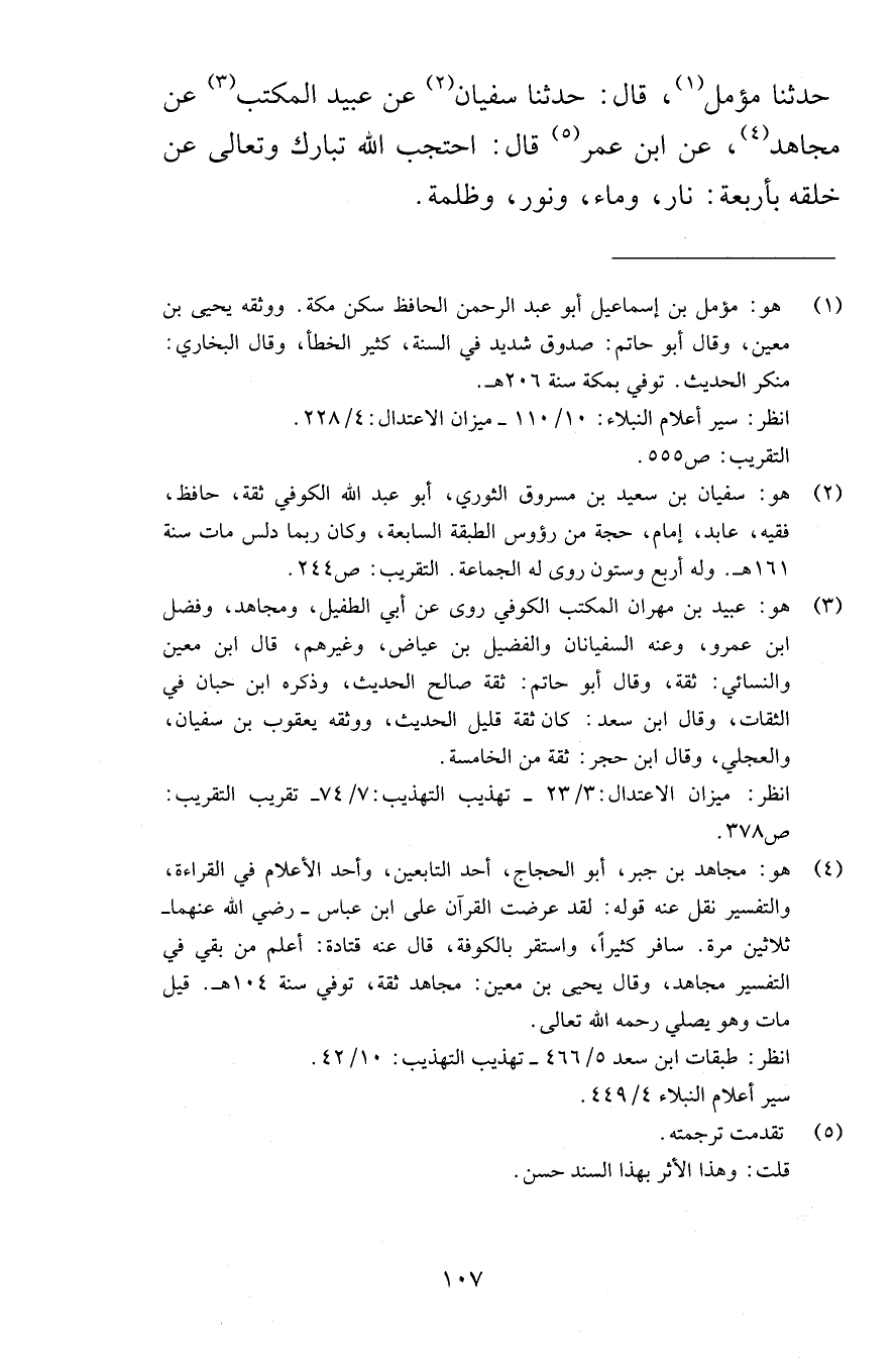 حدثنا مؤمل قال حدثنا سفيان عن عبيد المكتب عن مجاهد عن ابن عمر قال احتجب الله تبارك وتعالى عن خلقه بأربعة نار وماء ونور وظلمة