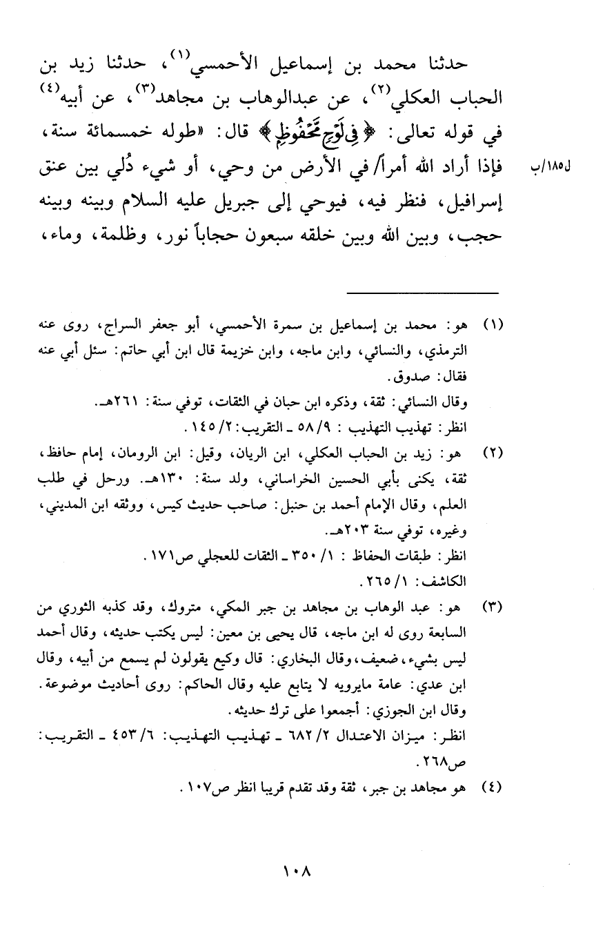 حدثنا محمد بن إسماعيل الأحمسي حدثنا زيد بن الحباب العكلي عن عبد الوهاب بن مجاهد عن أبيه في قوله تعالى فِي لَوْحٍ مَحْفُوظٍ قال طوله خمسمائة سنة فإذا أراد الله أمراً في الأرض من وحي أو شيء دُلي بين عنق إسرافيل فنظر فيه فيوحي إلى جبريل عليه السلام وبينه وبينه حجب وبين الله وبين خلقه سبعون حجاباً نور وظلمة وماء