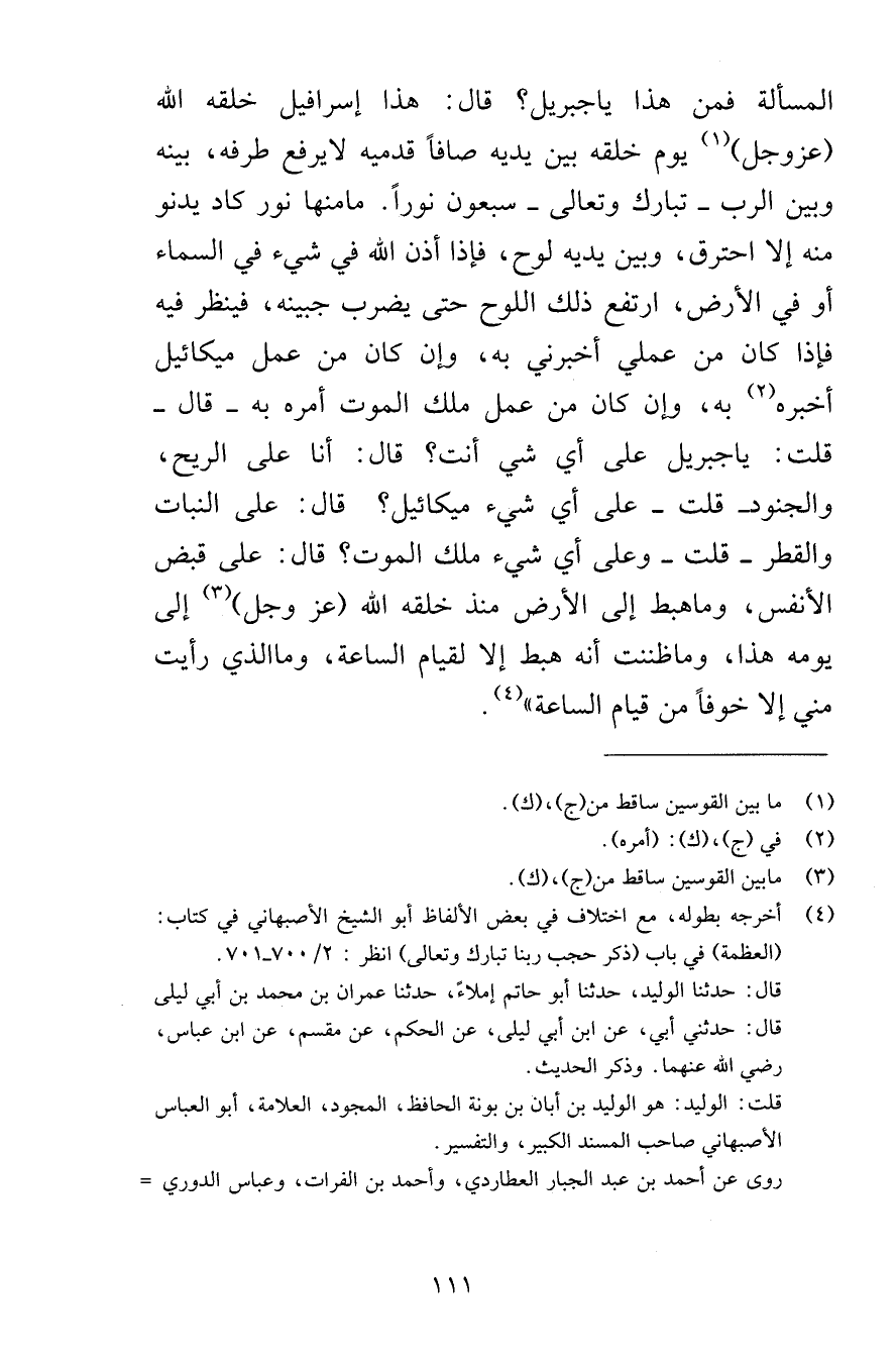 المسألة فمن هذا يا جبريل قال هذا إسرافيل خلقه الله عز وجل يوم خلقه بين يديه صافاً قدميه لا يرفع طرفه بينه وبين الرب تبارك وتعالى سبعون نوراً ما منها نور كاد يدنو منه إلا احترق وبين يديه لوح فإذا أذن الله في شيء في السماء أو في الأرض ارتفع ذلك اللوح حتى يضرب جبينه فينظر فيه فإذا كان من عملي أخبرني به وإن كان من عمل ميكائيل أخبره به وإن كان من عمل ملك الموت أمره به قال قلت يا جبريل على أي شيء أنت قال أنا على الريح والجنود قلت على أي شيء ميكائيل قال على النبات والقطر قلت وعلى أي شيء ملك الموت قال على قبض الأنفس وما هبط إلى الأرض منذ خلقه الله عز وجل إلى يومه هذا وما ظننت أنه هبط إلا لقيام الساعة وما الذي رأيت مني إلا خوفاً من قيام الساعة