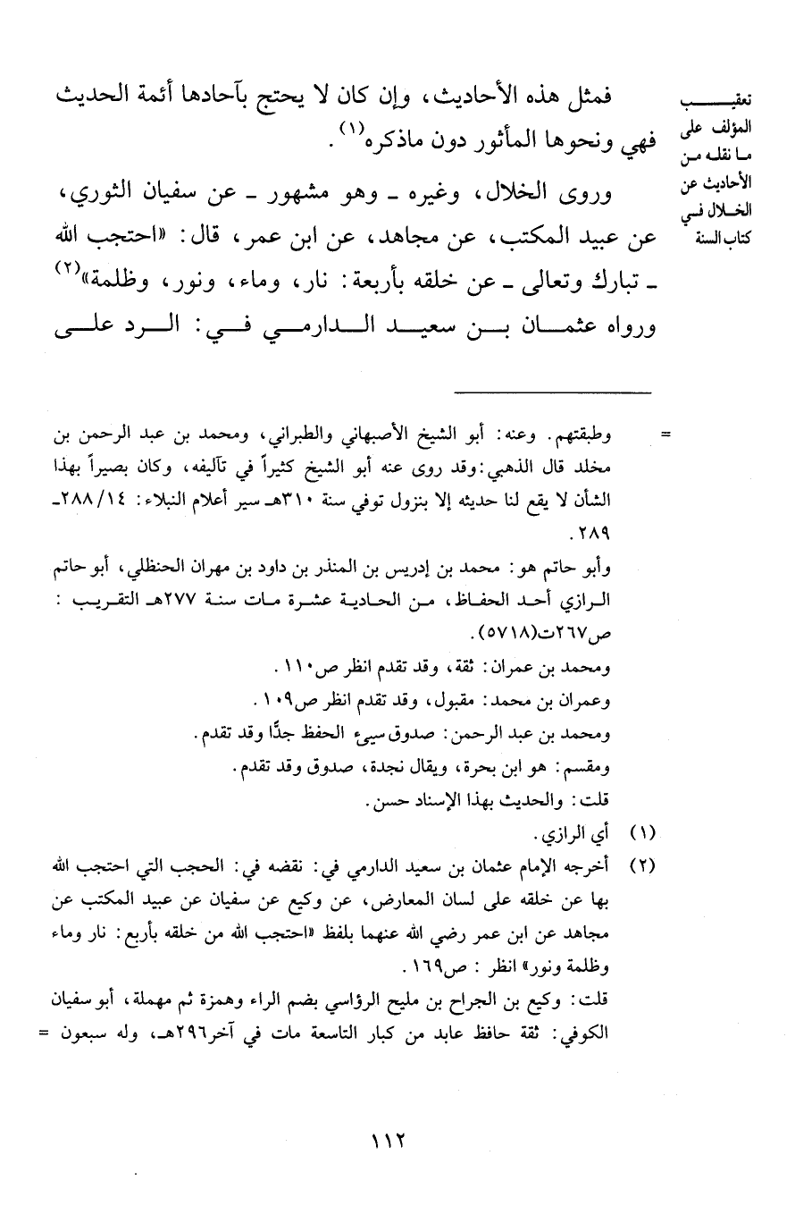فمثل هذه الأحاديث وإن كان لا يحتج بآحادها أئمة الحديث فهي ونحوها المأثور دون ما ذكره وروى الخلال وغيره وهو مشهور عن سفيان الثوري عن عبيد المكتب عن مجاهد عن ابن عمر قال احتجب الله تبارك وتعالى عن خلقه بأربعة نار وماء ونور وظلمة ورواه عثمان بن سعيد الدارمي في الرد على