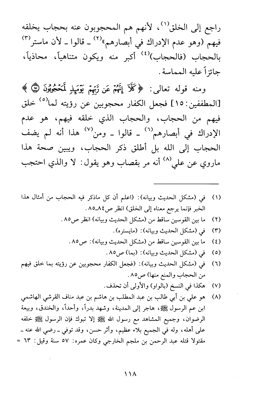راجع إلى الخلق لأنهم هم المحجوبون عنه بحجاب يخلقه فيهم وهو عدم الإدراك في أبصارهم قالوا لأن ما ستر بالحجاب فالحجاب أكبر منه ويكون متناهياً محاذياً جائزاً عليه المماسة ومنه قوله تعالى كَلَّا إِنَّهُمْ عَنْ رَبِّهِمْ يَوْمَئِذٍ لَمَحْجُوبُونَ (15) [المطففين 15] فجعل الكفار محجوبين عن رؤيته لما خلق فيهم من الحجاب والحجاب الذي خلقه فيهم هم عدم الإدراك في أبصارهم قالوا ومن هذا أنه لم يضف الحجاب إلى الله بل أطلق ذكر الحجاب ويبين صحة هذا ما روي عن علي أنه أمر بقصاب وهو يقول لا والذي احتجب
